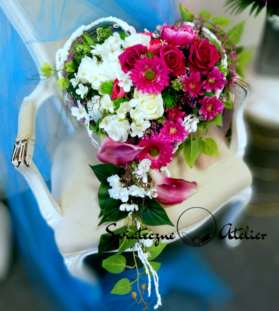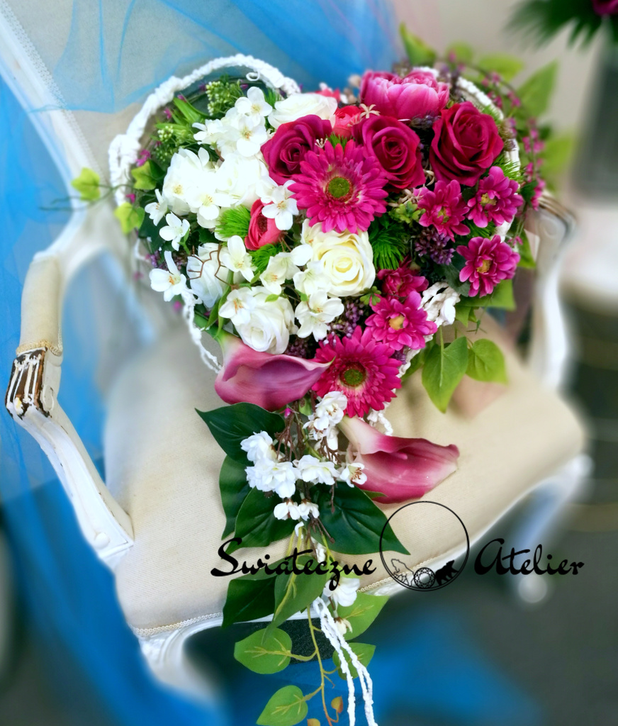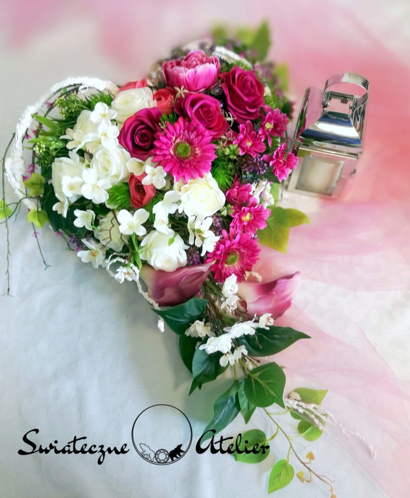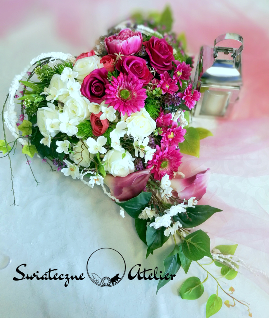 Amarantowe serce nr 723 to śliczna, kolorowa kompozycja na płytę nagrobną. Przepiękne gerbery i róże w amarantowym kolorze przeplataj się z gałązkami jabłoni, kaliami i margerytkami. Zielone listki podkreślają kolor kwiatów. Dekorację w całości wykonaliśmy ze sztucznych elementów, więc do złudzenia przypomina naturalną kompozycję. Stroik nagrobny pięknie zdobią zielone dodatki. Ze względu na kolorystykę oraz wykorzystane materiały, znakomicie zaprezentuje się na nagrobku.