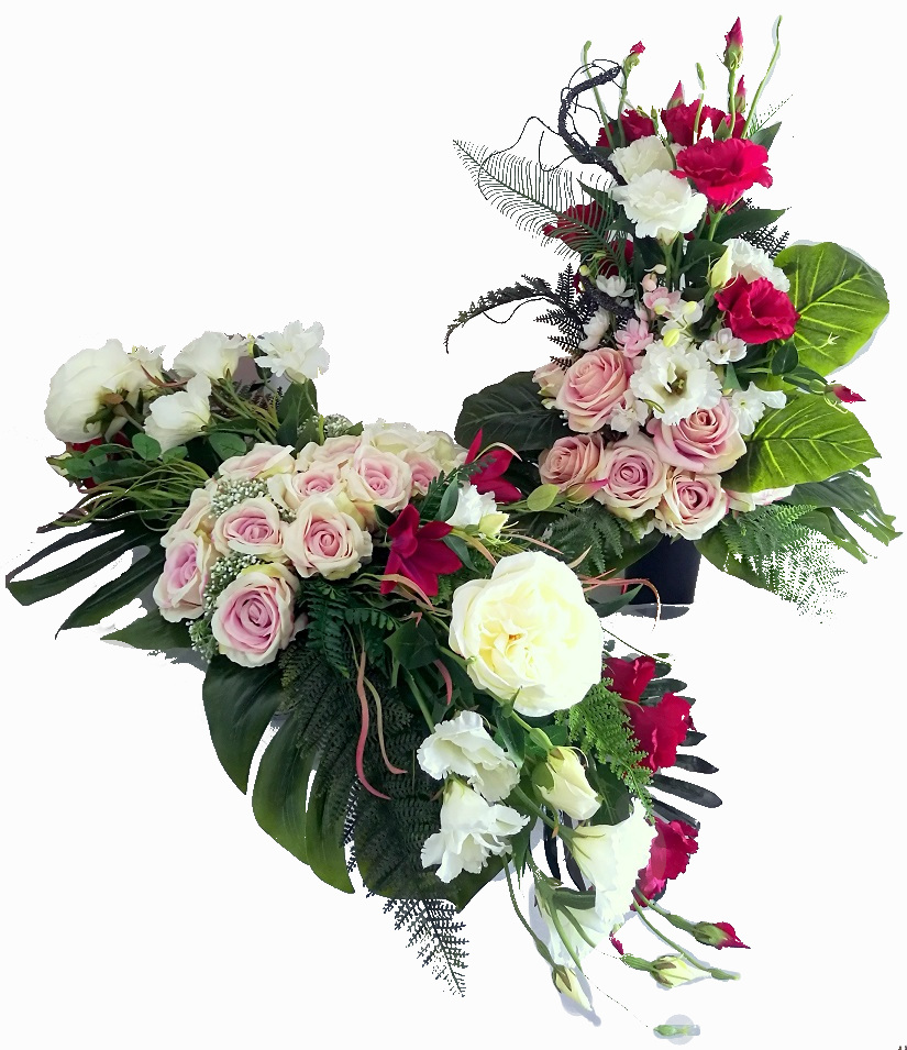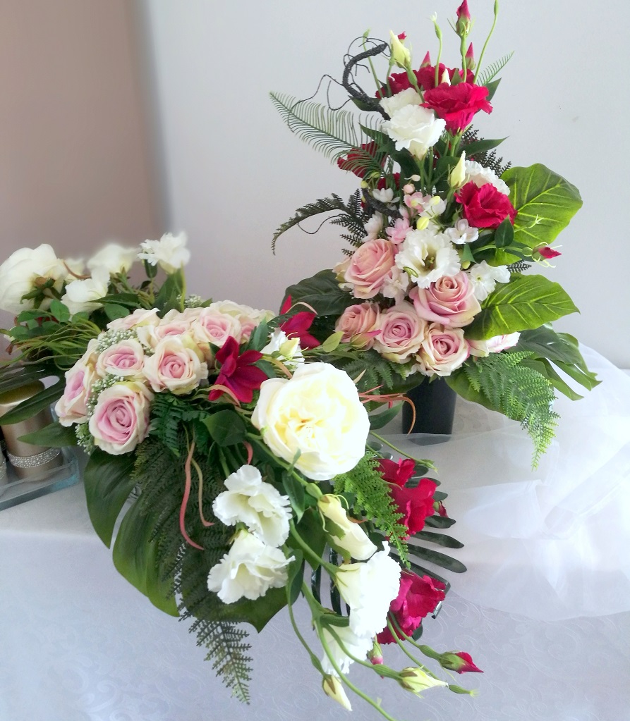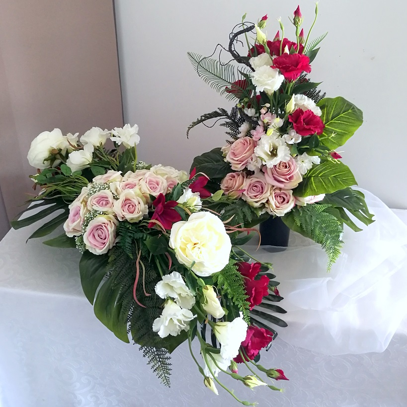 Amarantowy stroik i dwa bukiety nr 278 jest to unikatowa i nietuzinkowa kompozycja kwiatowa składająca się z dwóch bukietów oraz kompozycji leżącej. Stroik leżący to niezwykle elegancka i duża dekoracja. Na dekorację nagrobną składają się głównie róże i eustomy uzupełnione elementami zielonymi. Elementy zielone zastosowane w tej kompozycji nagrobnej to: paproć, liście palmy oraz liście monstery, uzupełnione drobnymi kwiatami i owocami. Całość osadzona jest w betonowej donicy by zachować stabilność przy zmiennych, typowych dla naszego klimatu, warunkach pogodowych . Prosta forma nadaje kompozycji lekkości i elegancji.Eustomy i róże pięknie ze sobą współgrają tworząc harmonijną całość. Bukiet oraz stroik praktycznie na każdym nagrobku będzie się prezentować pięknie ze względu na swoją okazałą formę oraz piękną kolorystykę. Bukiet umieszczony we wkładzie dzięki strzelistej formie i pęknej kolorystyce nikogo nie pozostawi obojętnym.