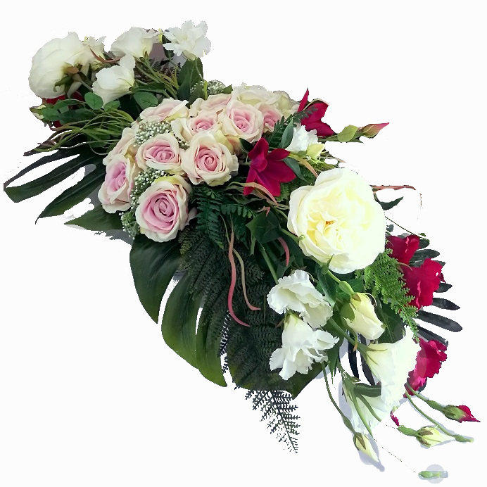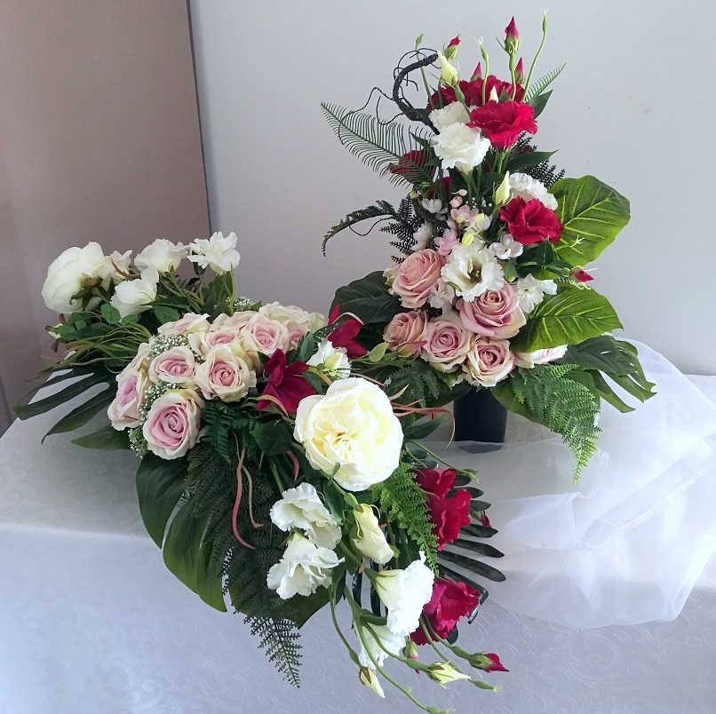 Wszystkie kwiaty wykorzystane w kompozycji to wysokiej jakości sztuczne kwiaty. Jest to elegancka alternatywa dla tradycyjnych wiązanek, sprzedawanych pod cmentarzami.