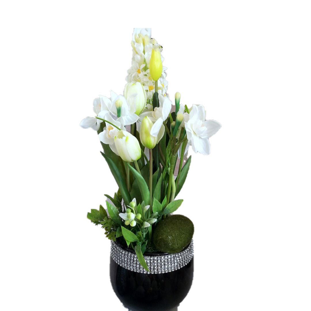 Białe hiacynty kompozycja kwiatowa nr 433 to piękna kompozycja przeznaczona do dekoracji wnętrza. Przepiękne gumowe tulipany w białym kolorze i hiacynty wysokiej jakości o silikonowych liściach pięknie się prezentują. Wyglądają jak żywe Kwiaty zostały osadzone w czarnej osłonce. Dekoracja wykonana z ogromną starannością i dbałością o szczegóły. Zielone liście wykorzystane w kompozycji pięknie ze sobą współgrają tworząc śliczną dekorację. Dekoracja długo będzie się prezentować pięknie. Prosta forma nadaje kompozycji lekkości i elegancji. Wysokiej jakości kwiaty oraz harmonia kompozycji ślicznie udekoruje zarówno ciemny jak i jasny mebel. Zielone elementy kompozycji podkreślają kolor kwiatów. Dekoracja jest urocza, powiew wiosny po prostu czujemy na twarzy.