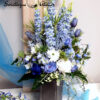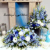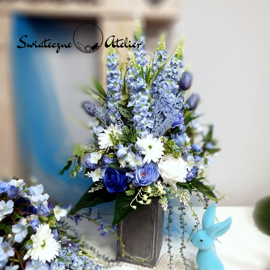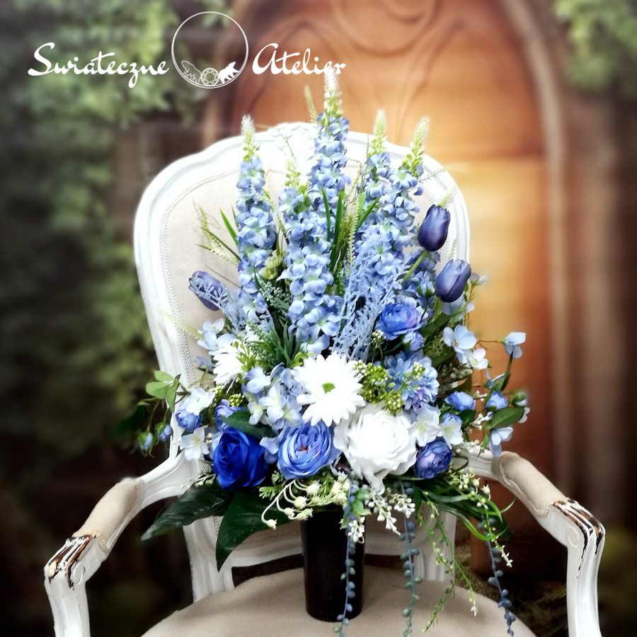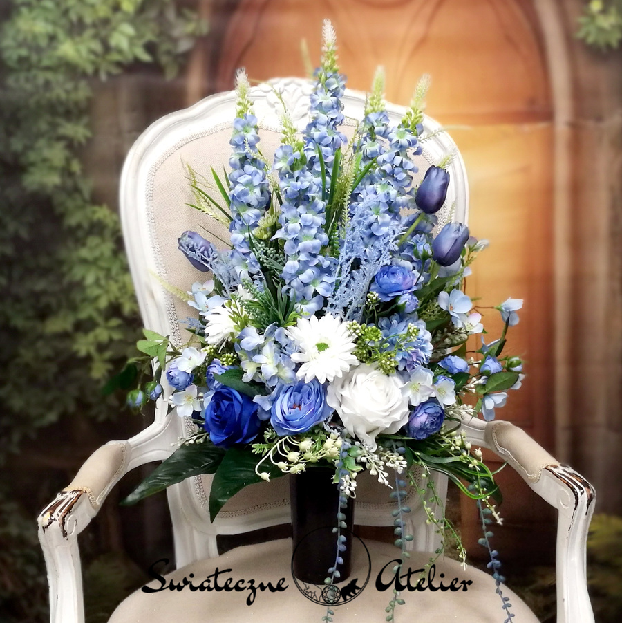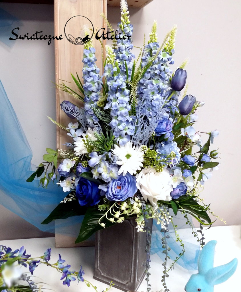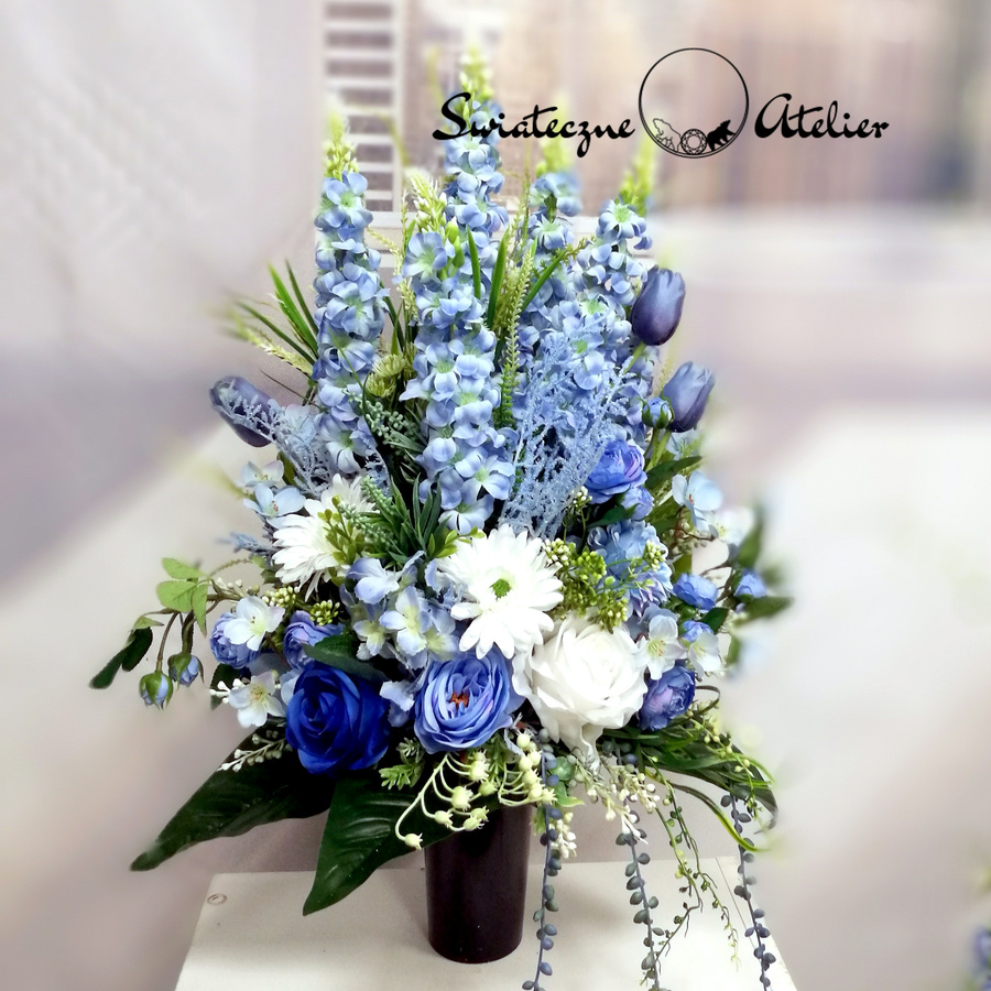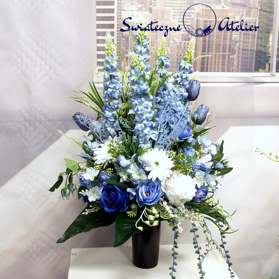 Błękit nieba bukiet nagrobny nr 1184 to śliczna dekoracja przeznaczona na cmentarz. Delikatne kwiaty w odcieniach niebieskiego i bieli tworzą piękną kompozycję. Dekoracja w całości została wykonana ze sztucznych elementów, które do złudzenia przypominają naturalne. Bukiet ze względu na kolorystykę znakomicie będzie prezentował się na nagrobku. Kompozycja jest niespotykana i wyjątkowa.