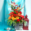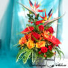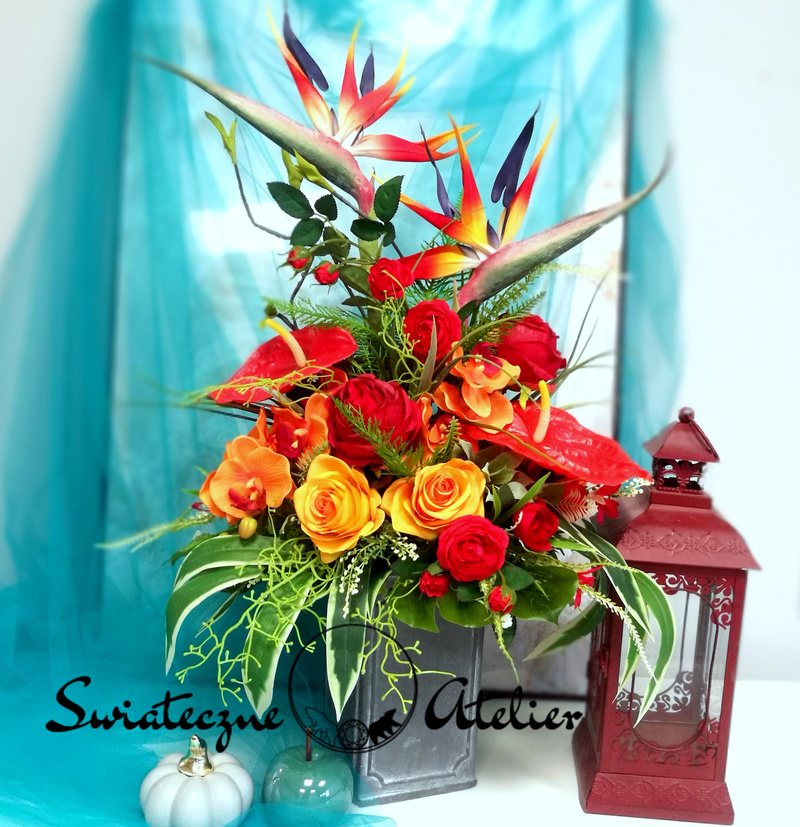 Bukiet nagrobny Czerwone anturium i strelicje nr 1313 jest to piękna kompozycja kwiatowa. Dekorację osadziliśmy w plastikowym wkładzie. Cudownej jakości strelicje zostały uzupełnione zielonymi dodatkami oraz anturium i różami . Kwiaty utrzymaliśmy w klimatycznej kolorystyce, więc tworzą wyjątkową kompozycję. Rośliny, których użyliśmy do tej dekoracji nagrobnej są w pięknych kolorach i dekoracja niezależnie od pory roku będzie prezentować się pięknie. Piękne róże stanowią uzupełnienie kompozycji. Ciekawa forma nadaje bukietowi charakteru i elegancji. Wysokiej jakości kwiaty oraz harmonia kompozycji pięknie zaprezentują się zarówno na ciemnym jak i jasnym nagrobku. Zielone elementy podkreślają kolor kwiatów dekoracji.