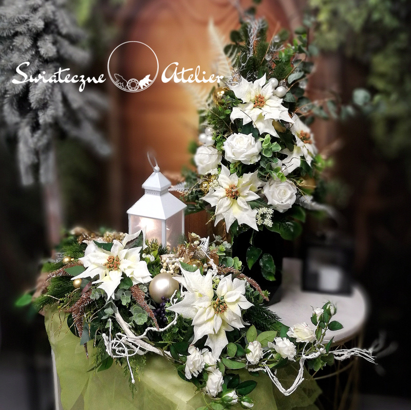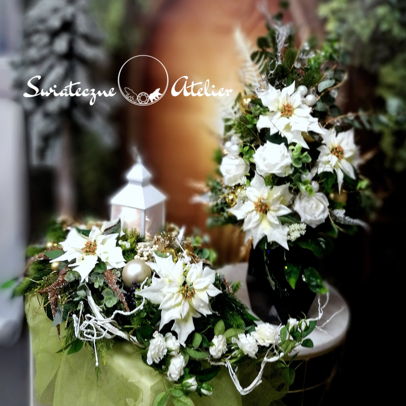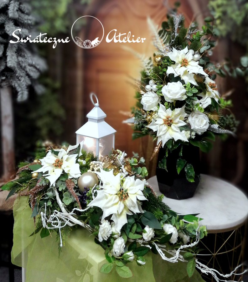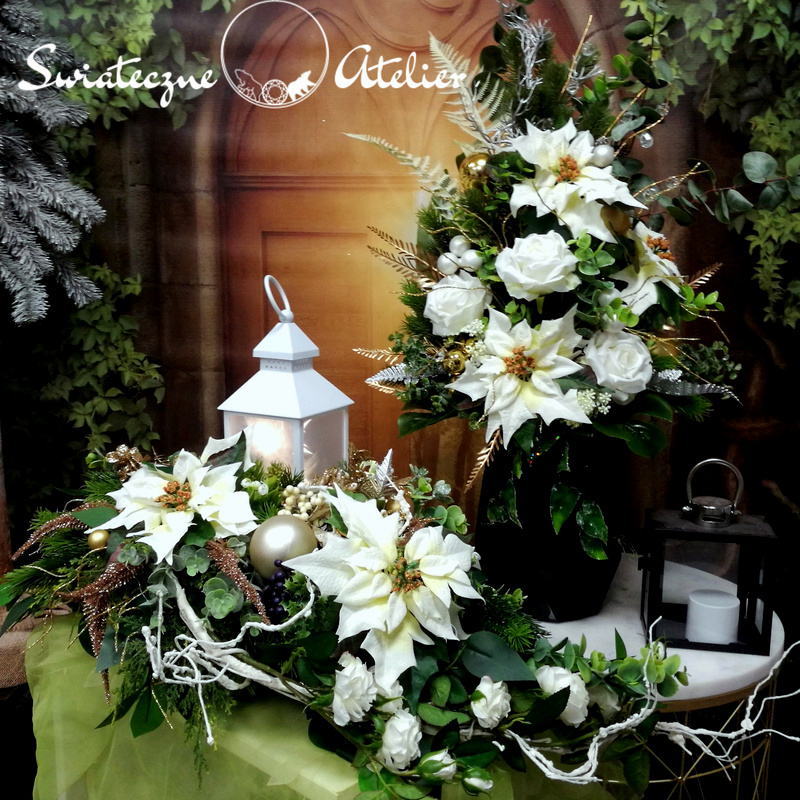 Bukiet nagrobny i stroik Biała gwiazda nr 1344 to unikatowa i piękna kompozycja kwiatowa. Bukiet został umieszczony w plastikowym wkładzie, a stroik w obciążonej donicy. Kompozycja została ozdobiona świątecznymi dodatkami, które pięknie podkreślają kolorystykę. Gwiazdy betlejemski, bombki, naturalne dodatki, sztuczne owoce nadają świątecznego charakteru. Kwiaty pięknie ze sobą współgrają tworząc harmonijną całość.