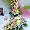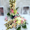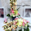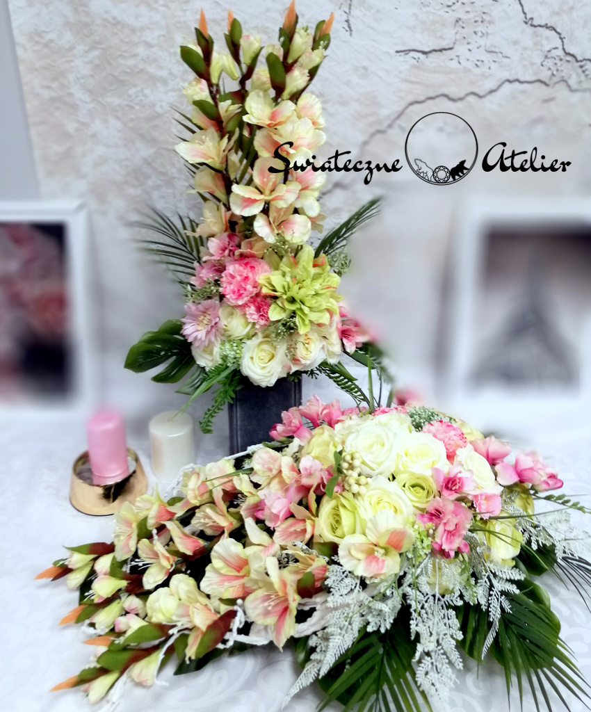 Wszystkie kwiaty wykorzystane w kompozycji to wysokiej jakości sztuczne kwiaty. Jest to elegancka alternatywa dla tradycyjnych wiązanek, sprzedawanych pod cmentarzami.