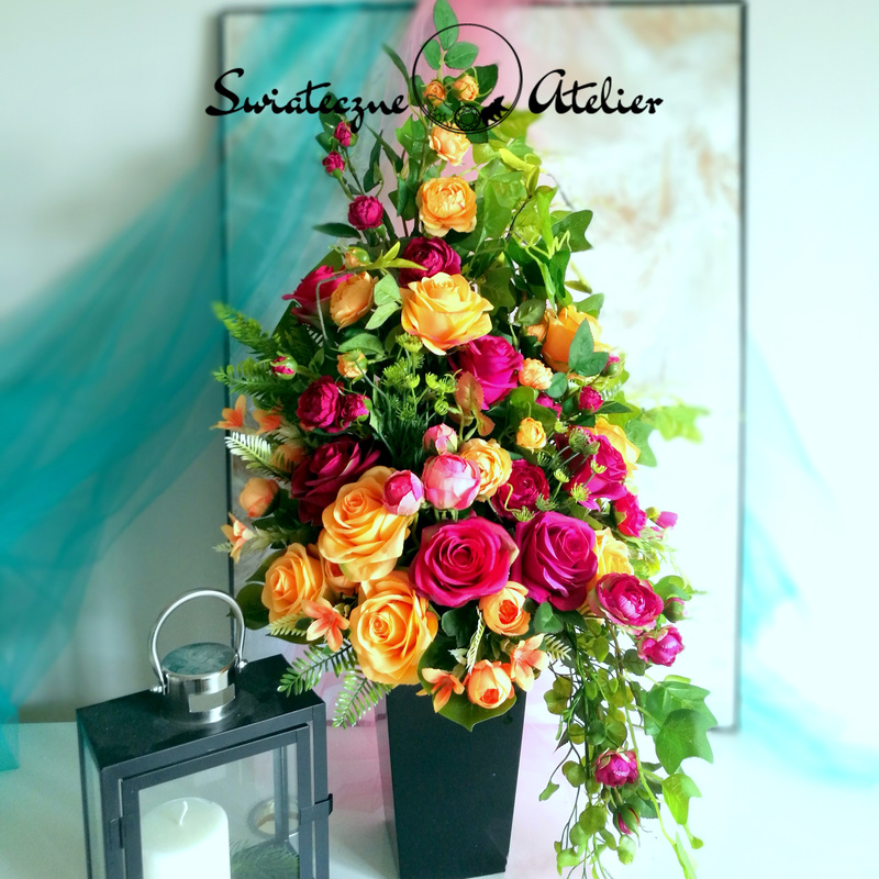 Każdą z naszych dekoracji wykonujemy ręcznie, więc gwarantujemy, że dekoracja, którą Wam dostarczymy, będzie jedyna w swoim rodzaju. Ze względu na to, że nasze kompozycje wykonujemy są za każdym razem ręcznie oraz sezonowość wykorzystywanych w kompozycjach dodatków – kompozycja przygotowana dla Państwa może delikatnie różnić się od przedstawionej na zdjęciu. Gwarantujemy natomiast jakość i estetykę wykonania Państwa zamówienia.