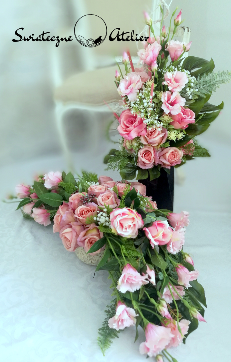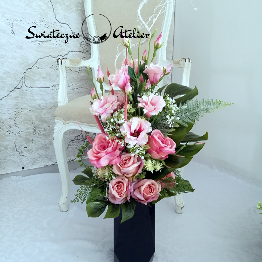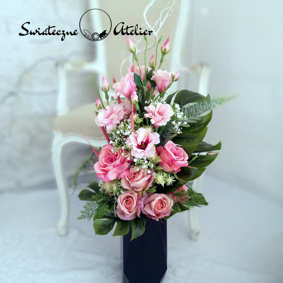 Bukiet nagrobny Noce i dnie nr 435 jest przepiękną, delikatną kompozycją kwiatową. Kwiaty, które wykorzystaliśmy w kompozycji uzupełniliśmy są zielonymi elementami. Przepiękne eustomy w delikatnym odcieniu różu oraz klimatyczne dodatki i zielone liście tworzą wyjątkową dekorację. Kwiaty, jakie występują w tej dekoracji nagrobnej, są uniwersalnej urody, dlatego dekoracja, niezależnie od pory roku, będzie prezentować się pięknie. Prosta forma nadaje kompozycji lekkości i elegancji. Wysokiej jakości kwiaty oraz harmonia kompozycji pięknie zaprezentują się zarówno na ciemnym jak i jasnym nagrobku. Zielone elementy kompozycji atrakcyjnie podkreślają kolor kwiatów. Bukiet został umieszczony w plastikowym wkładzie.