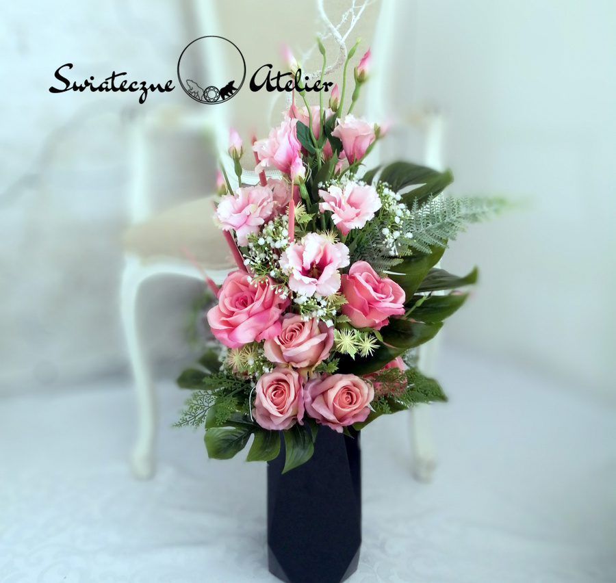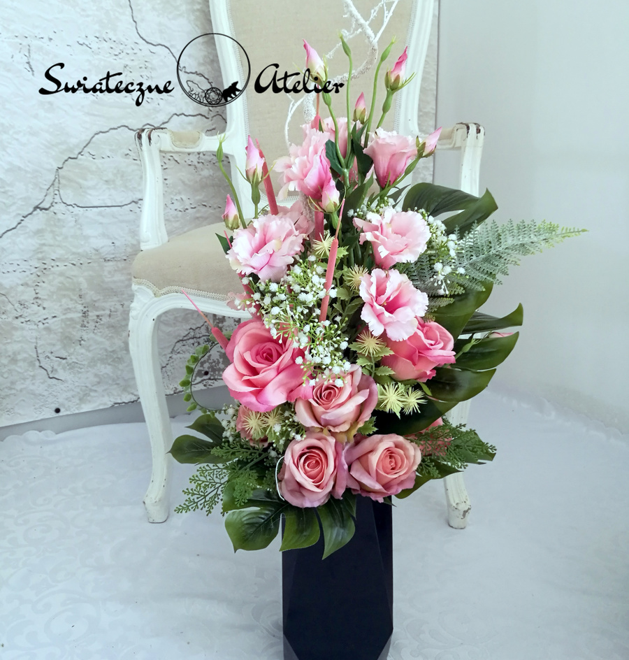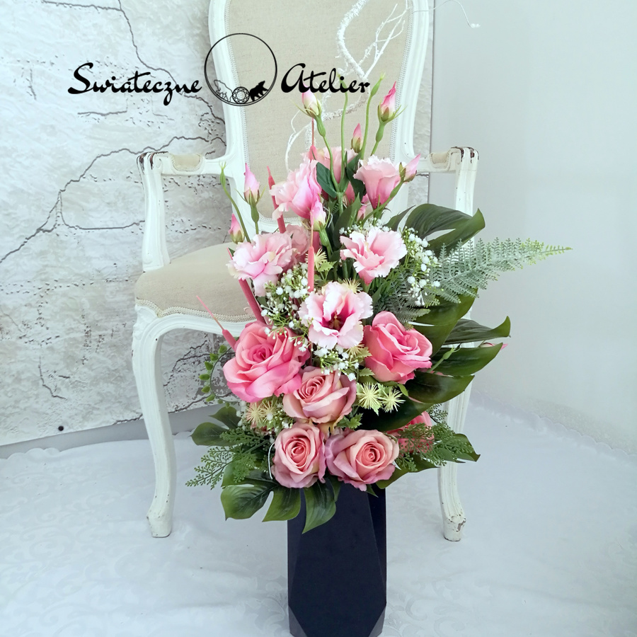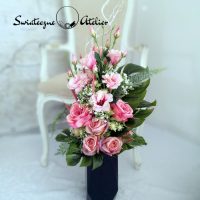 Wszystkie kwiaty wykorzystane w kompozycji to wysokiej jakości sztuczne kwiaty. Jest to elegancka alternatywa dla tradycyjnych wiązanek, sprzedawanych pod cmentarzami.