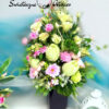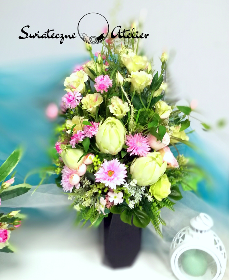 Bukiet nagrobny pastelowy duży nr 1417 jest to piękna  kompozycja kwiatowa. Dekorację umieściliśmy w plastikowym wkładzie.  Przepiękne  kwiaty, jakich użyliśmy w kompozycji, uzupełniliśmy zielonymi elementami. Śliczne gałązki kwiatowe do złudzenia przypominają żywe tworząc  wyjątkową dekorację. Kwiaty zastosowane do tej dekoracji nagrobnej są w klimatycznych kolorach i dekoracja długo będzie prezentować się pięknie.  Prosta forma nadaje kompozycji lekkości i elegancji.  Mamy tu wysokiej jakości kwiaty oraz harmonię kompozycji, więc całość pięknie będzie prezentować się zarówno na ciemnym jak i jasnym nagrobku. Dekoracja ta jest niespotykana, a zielone elementy podkreślają kolor zastosowanych  elementów. Bukiet umieściliśmy w plastikowym wkładzie do wazonu.