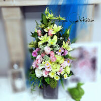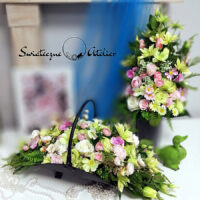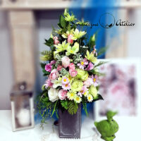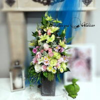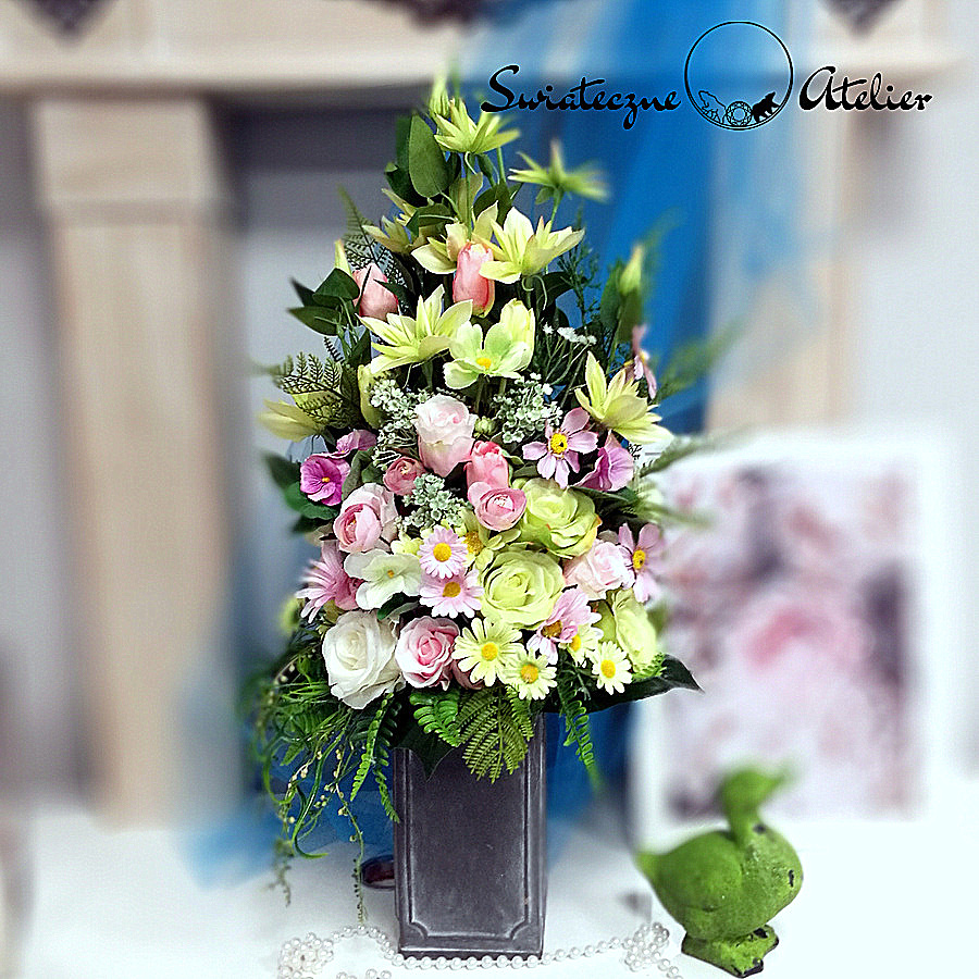 Bukiet nagrobny Pistacja i róż nr 1183 to śliczna dekoracja przeznaczona na cmentarz. Delikatne kwiaty w odcieniach różu i pistacji tworzą śliczną kompozycję. Dekoracja w całości została wykonana ze sztucznych elementów, które do złudzenia przypominają naturalne. Bukiet ze względu na kolorystykę znakomicie będzie prezentował się na nagrobku. Kompozycja jest niespotykana i wyjątkowa.