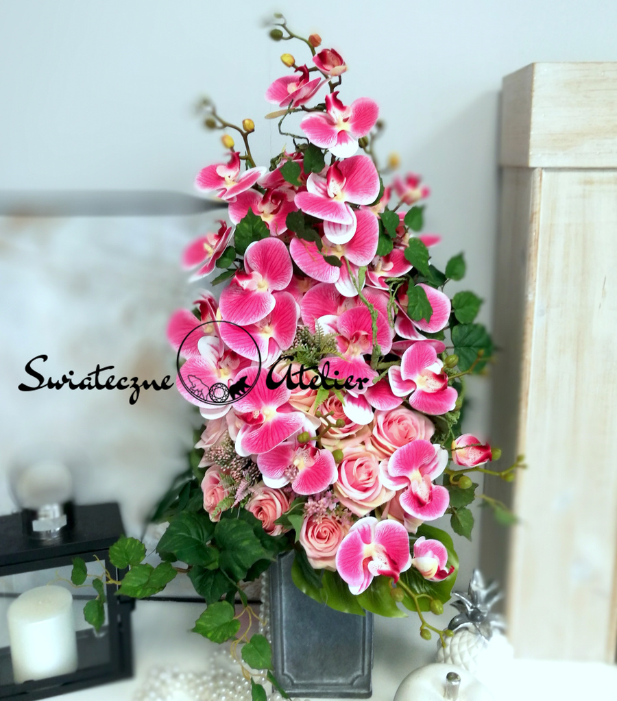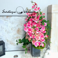 Bukiet nagrobny Różowe storczyki nr 1034 jest to urocza kompozycja kwiatowa. Został on osadzony w uniwersalnym wkładzie do wazonów. Cudowne, gumowe storczyki w pięknym kolorze dopełniają róże, leszczyna, sztuczne gałązki. Kwiaty zastosowane do tej dekoracji nagrobnej są bardzo dobrej jakości i dekoracja długo będzie prezentować się pięknie. Prosta forma nadaje kompozycji lekkości i elegancji oraz gwarantuje piękny wygląd zarówno na ciemnym jak i jasnym nagrobku. Dekoracja ta jest niespotykana a zielone elementy podkreślają kolor zastosowanych elementów.