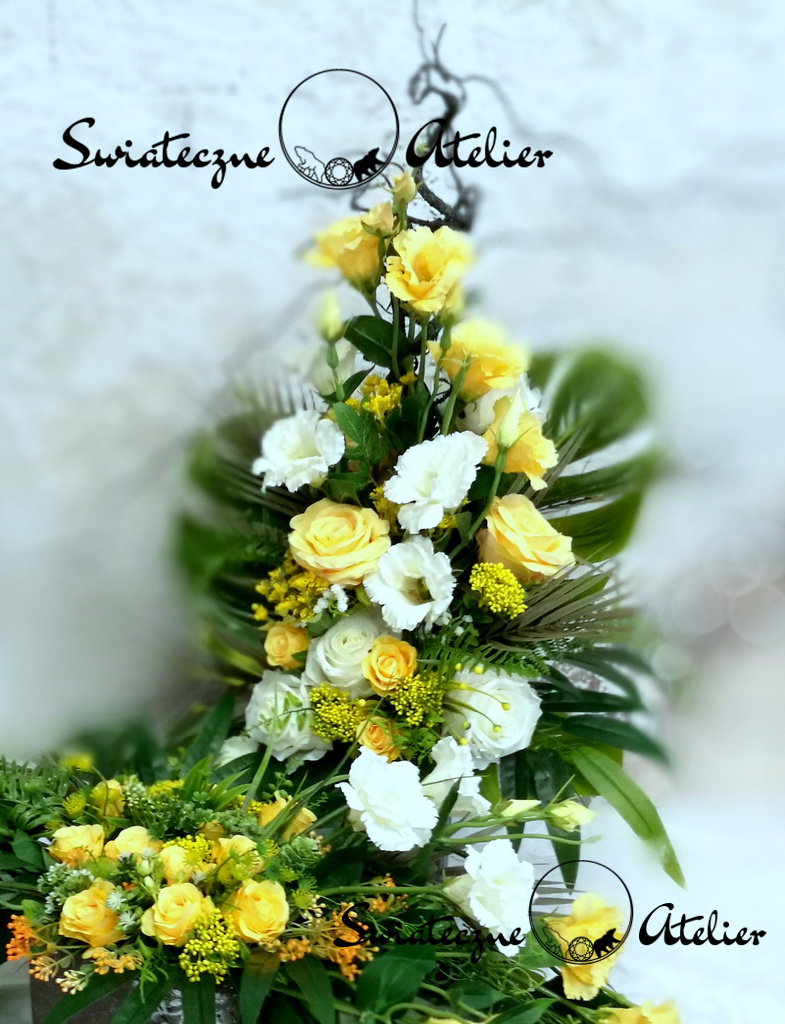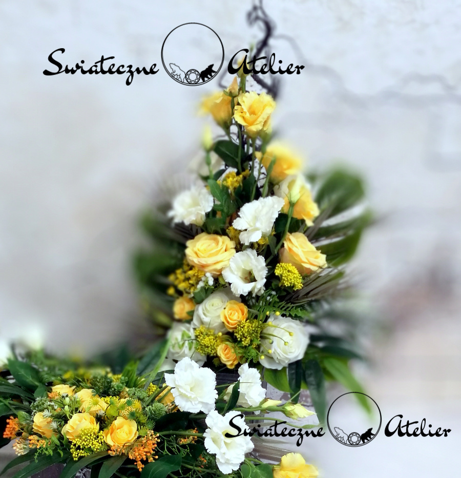 Bukiet nagrobny Wiosenna symfonia 2 nr 704 to piękna dekoracja nagrobna. Przepiękne gałązki eustomy, róże oraz zielone dodatki wykorzystane w kompozycji pięknie ze sobą współgrają tworząc śliczną dekorację. Kwiaty, które zastosowałyśmy do tej dekoracji wiosennej są w pięknych odcieniach żółci i bieli. Dekoracja długo będzie się prezentować pięknie. Prosta forma nadaje kompozycji lekkości i elegancji. Wysokiej jakości kwiaty oraz harmonia kompozycji ślicznie udekorują zarówno ciemny jak i jasny nagrobek. Zielone elementy kompozycji podkreślają kolor kwiatów. Dekoracja niespotykana i bardzo elegancka. Uroku całości dodaje elegancka kolorystyka. Jest to kompozycja wiosenna o charakterze całorocznym.