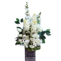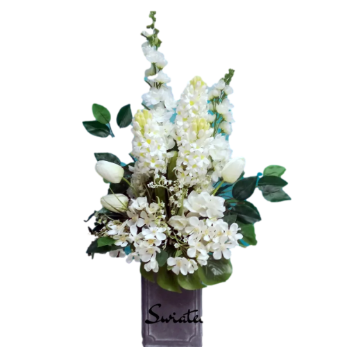 Bukiet nagrobny Wiosna w bieli nr 708 to wyjątkowa kompozycja kwiatowa. Dekoracja jest umieszczona w plastikowym wkładzie. Kwiaty, które wykorzystaliśmy w kompozycji uzupełniliśmy są zielonymi elementami. Klimatyczne dodatki i zielone liście tworzą wyjątkową dekorację. Kwiaty, jakie występują w tej dekoracji nagrobnej są uniwersalnej urody i dekoracja niezależnie od pory roku będzie prezentować się pięknie. Dobrej jakości materiały oraz harmonia kompozycji pięknie zaprezentują się zarówno na ciemnym jak i jasnym nagrobku. Zielone elementy kompozycji atrakcyjnie podkreślają kolor kwiatów. Bukiet jest okazały i elegancki.