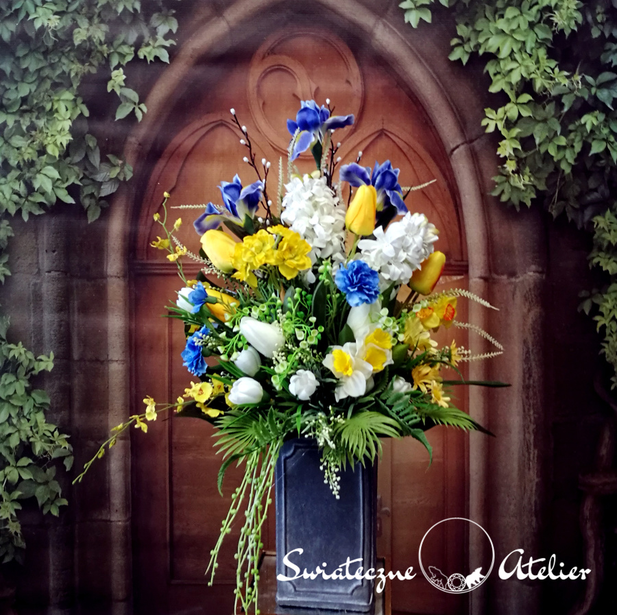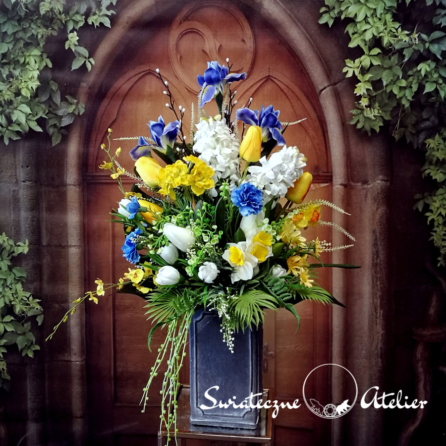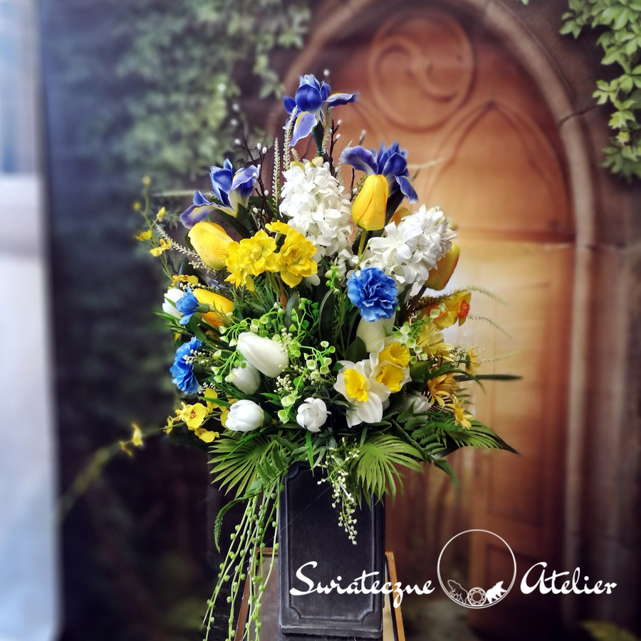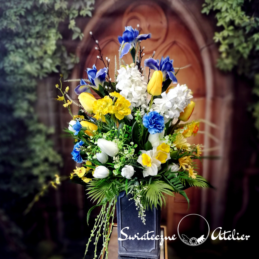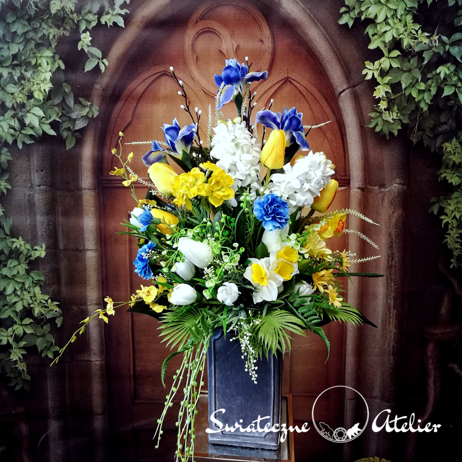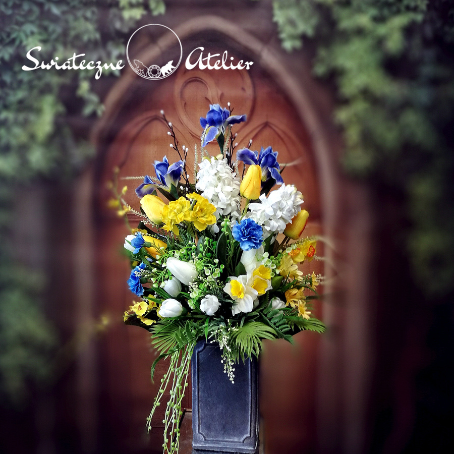 Bukiet nagrobny Wiosny czar nr 1213 jest śliczną kompozycją kwiatową. Dekorację osadziliśmy w plastikowym wkładzie. Piękne, wiosenne kwiaty zostały uzupełnione zielonymi dodatkami. Kwiaty utrzymaliśmy w energetycznej kolorystyce, więc tworzą wyjątkową kompozycję. Kwiaty, których użyliśmy do tej dekoracji nagrobnej są w pięknych kolorach i dekoracja niezależnie od pory roku będzie prezentować się pięknie. Piękne irysy, żonkile, hiacynty stanowią trzon kompozycji. Prosta forma nadaje bukietowi lekkości i elegancji. Wysokiej jakości kwiaty oraz harmonia kompozycji pięknie zaprezentują się zarówno na ciemnym jak i jasnym nagrobku. Zielone elementy podkreślają kolor kwiatów dekoracji.