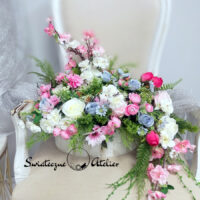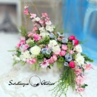 Dekoracja kwiatowa Maj nr 279 jest to śliczna, kompozycja kwiatowa. Przepiękna jabłoń w delikatnym różowym kolorze, które wykorzystaliśmy w kompozycji, uzupełniliśmy różami, pełnikami, zielonymi elementami. Kwiaty wykorzystane do tej dekoracji j są w pięknych kolorach. Dlatego cała kompozycja, niezależnie od pory roku, zawsze będzie się pięknie prezentować. Jej prosta forma nadaje kompozycji lekkości i elegancji. Wysokiej jakości kwiaty oraz harmonia kompozycji przyciągnie oko nawet wybrednego estety. Zielone elementy bukietu doskonale podkreślają kolor kwiatów. Jak widać, dekoracja kwiatowa Maj, to naprawdę niespotykana i bardzo elegancka propozycja.