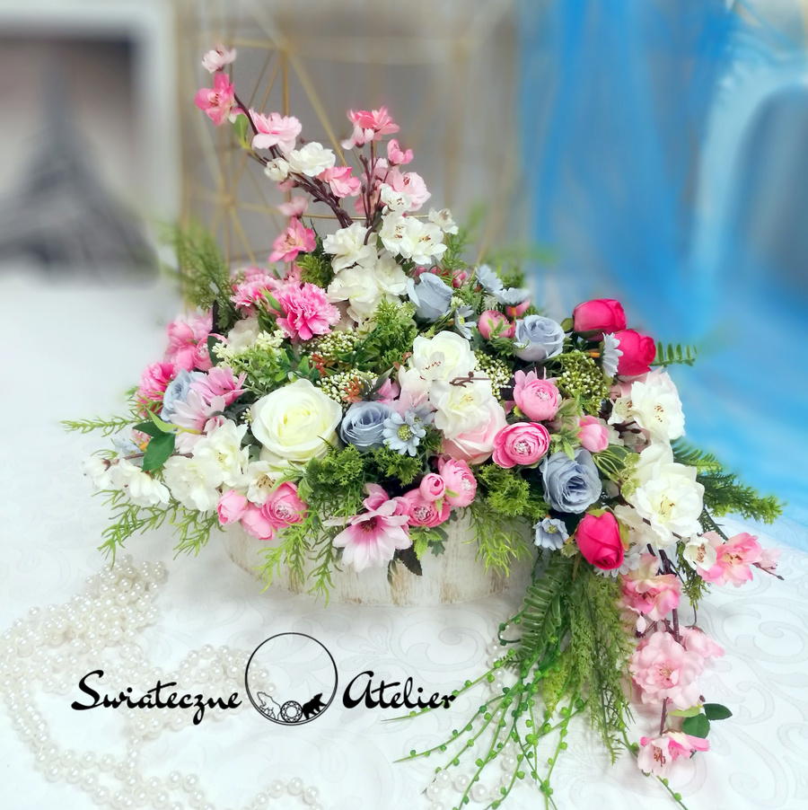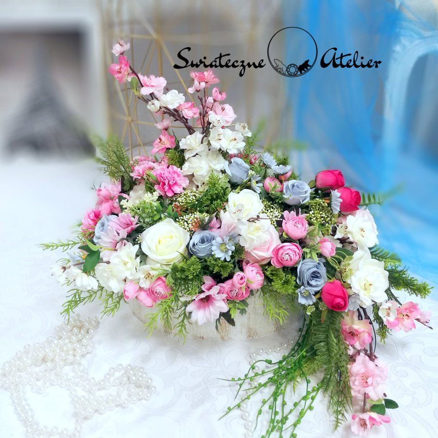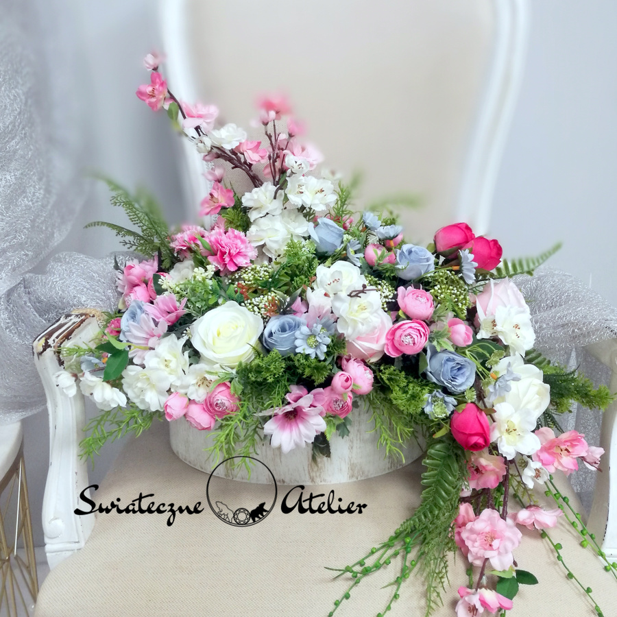 Wszystkie kwiaty wykorzystane w kompozycji to wysokiej jakości sztuczne kwiaty, które z pewnej odległości są nie do odróżnienia od swoich oryginałów. Ich atutem natomiast jest to, że nie wymagają podlewania, nie więdną i zawsze wyglądają równie świeżo, jak na początku.
