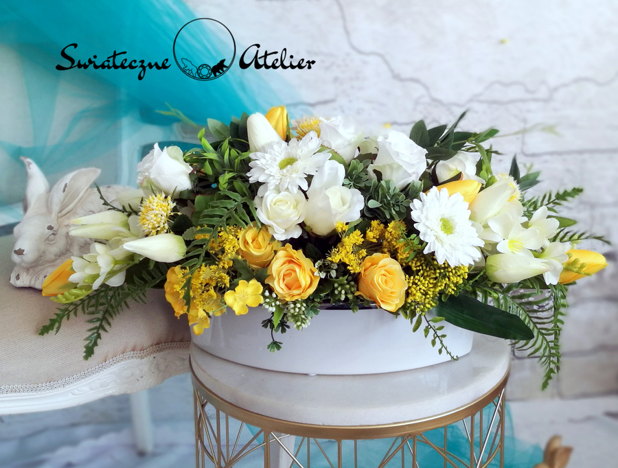 Dekoracja kwiatowa Pogodny Poranek nr 673 to śliczna dekoracja, którą umieściliśmy w przepięknej, porcelanowej śnieżnobiałej donicy. Wysokiej jakości sztuczne kwiaty tworzą niepowtarzalną, lekką i delikatną kompozycję. Dekorację ozdobiliśmy kilkoma rodzajami zielonych dodatków. Kwiatostany są miękkie i delikatne w dotyku, więc do złudzenia przypominają naturalne. Kompozycja znakomicie nadaje się na prezent. Dekoracja jest urocza i doskonale podkreśli wnętrze. Znakomicie wprowadzi wiosenny nastrój, a także pięknie ozdobi świąteczny stół. Cudowna dekoracja do restauracji, hoteli, pensjonatów, gdzie z pewnością wspaniale podkreśli wnętrze.