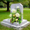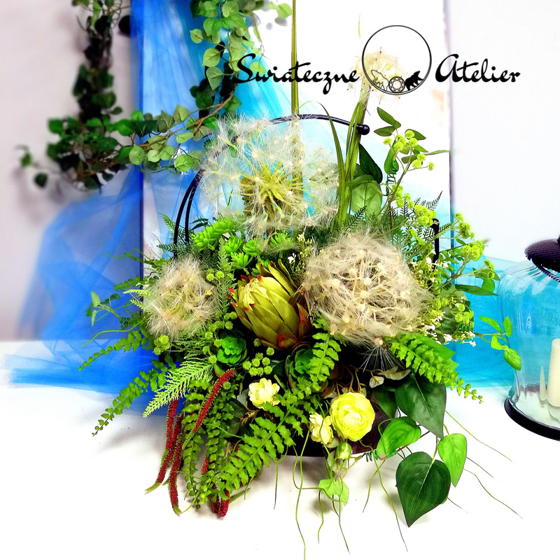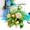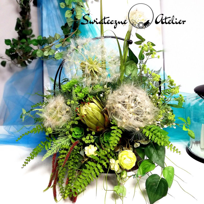 Dekoracja nagrobna Dmuchawce nr 1494 jest to piękna kompozycja kwiatowa osadzona w obciążonej podstawie. Kwiaty pięknie się prezentują , kompozycja uzupełniona zielonymi dodatkami wygląda wiosennie i elegancko. Kwiaty utrzymaliśmy w subtelnej kolorystyce tworzą wyjątkową kompozycję. Rośliny, których użyliśmy do tej dekoracji nagrobnej są w pięknych kolorach i dekoracja niezależnie od pory roku będzie prezentować się pięknie. Klimatyczne dodatki stanowią uzupełnienie kompozycji. Ciekawa forma nadaje stroikowi charakteru i elegancji. Wysokiej jakości kwiaty oraz harmonia kompozycji pięknie prezentują się zarówno na ciemnej jak i jasnej płycie. Dekorację uzupełnia metalowy półksiężyc.