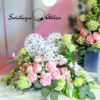 Dekoracja nagrobna z sercem Delikatność nr 1433 jest to piękna kompozycja kwiatowa. Stroik osadzony jest w obciążonym naczyniu. Kwiaty wysokiej jakości pięknie się prezentują. Wiklinowe serduszka otaczają kwiaty w subtelnej kolorystyce. Całość uzupełniona jest zielonymi dodatkami i wiosennymi akcentami. Kwiaty utrzymaliśmy w ciekawej kolorystyce tworzą wyjątkową kompozycję. Rośliny, których użyliśmy do tej dekoracji nagrobnej są w pięknych kolorach i dekoracja niezależnie od pory roku będzie prezentować się pięknie. Klimatyczne dodatki stanowią uzupełnienie kompozycji. Ciekawa forma nadaje stroikowi charakteru i elegancji. Wysokiej jakości kwiaty oraz harmonia kompozycji pięknie zaprezentują się zarówno na ciemnym jak i jasnym nagrobku.