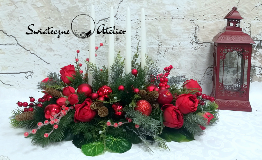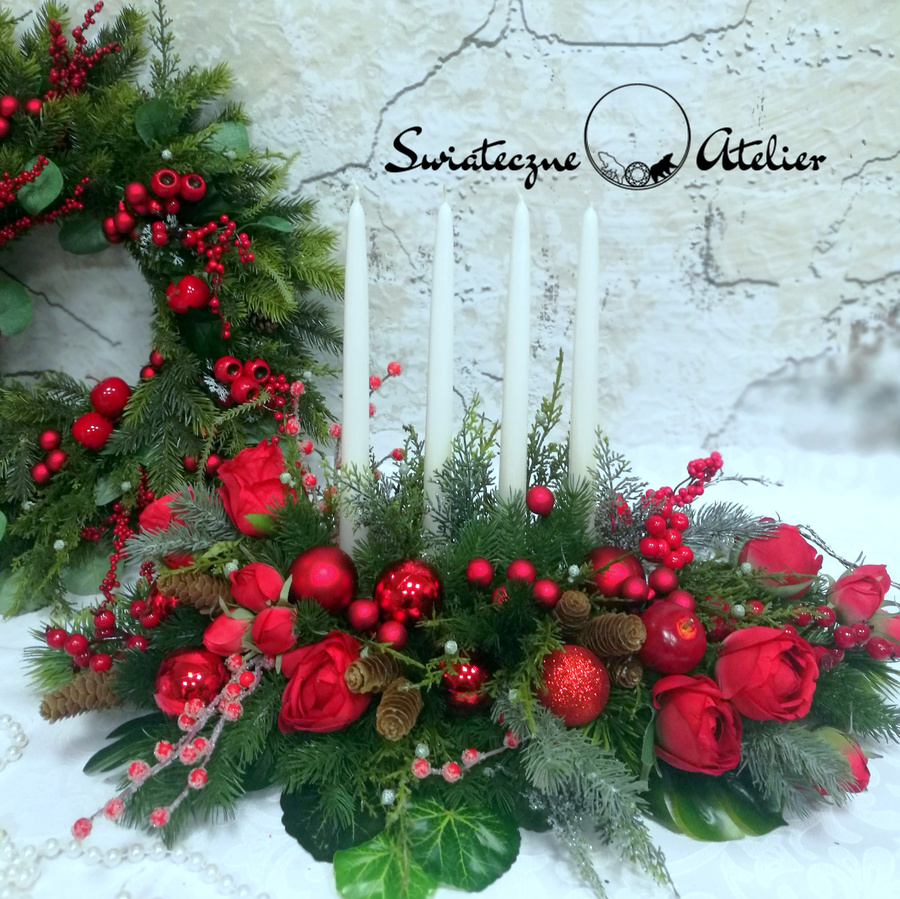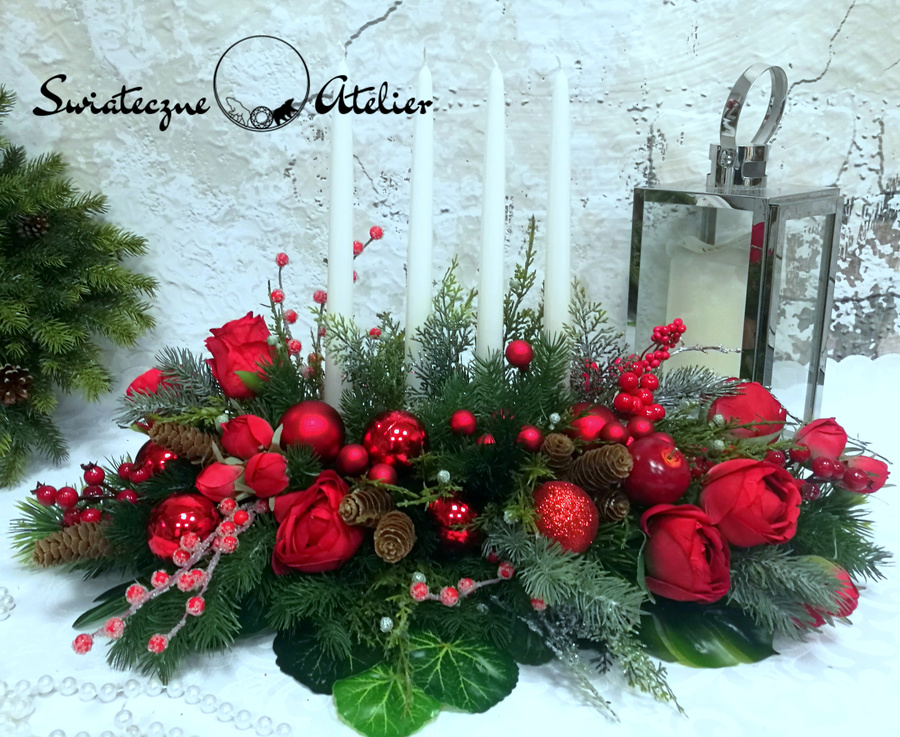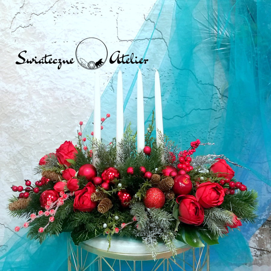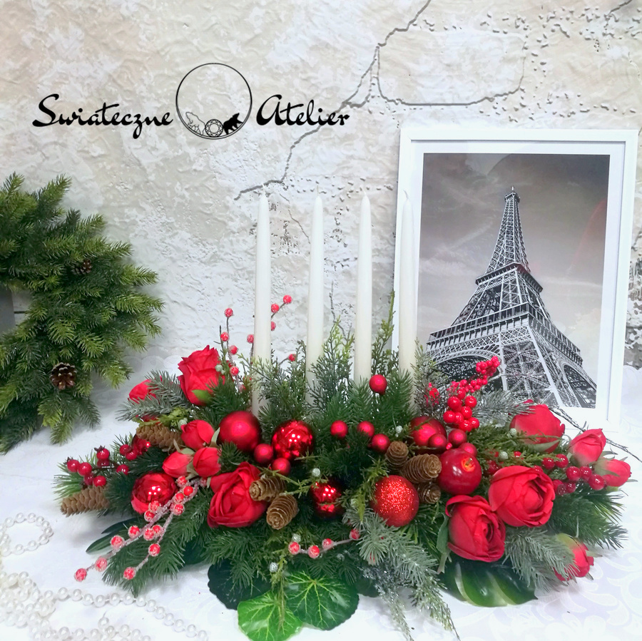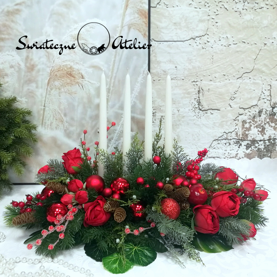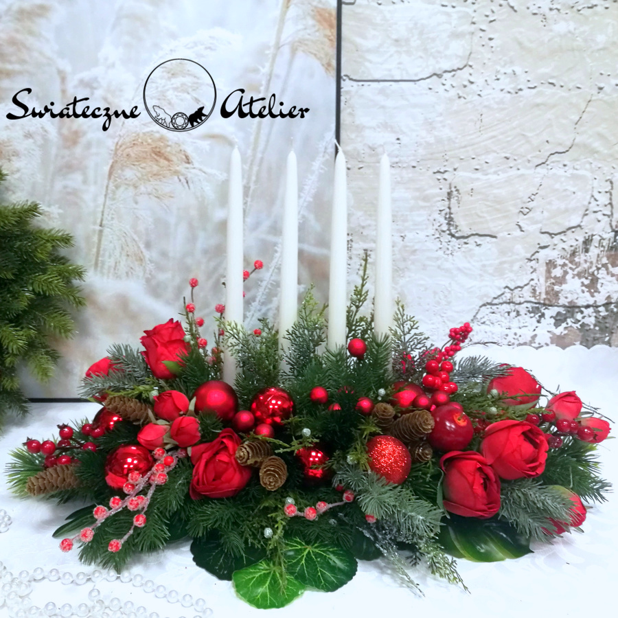 Dekoracja świąteczna w czerwieni nr 594 jest to dekoracja świąteczna, która będzie cieszyć oko przez długi czas. Pięknie będzie się prezentować zarówno na w salonie jak i w biurze. Stroik wykonany został z wysokiej jakości materiałów, będzie elegancko prezentować się w tym wyjątkowym okresie. Iglaste gałązki, bombki, srebrne gałązki oraz zielone dodatki wykorzystane w kompozycji pięknie ze sobą współgrają tworząc śliczną dekorację. Dodatki, które zastosowałyśmy do tej dekoracji świątecznej są w pięknych odcieniach czerwieni i ciemnej zieleni. Prosta forma nadaje kompozycji lekkości i elegancji. Wysokiej jakości kwiaty oraz harmonia kompozycji ślicznie udekorują zarówno ciemny jak i jasny mebel. Piękne, lakierowane świece dodają wyjątkowego uroku. Zielone elementy kompozycji podkreślają kolor bombek. Piękna kolorystyka sprawdzi się praktycznie w każdym wnętrzu.