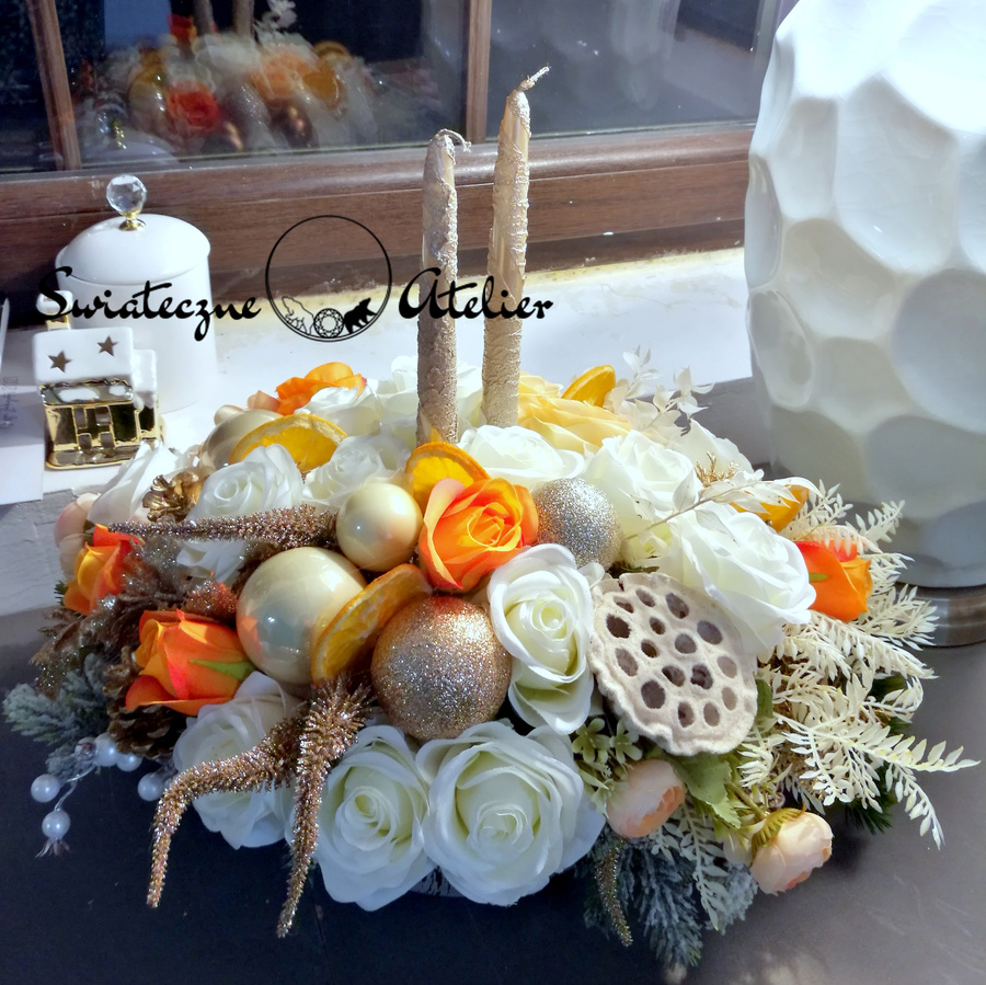 Dekoracja świąteczna Zapach pomarańczy nr 600 jest to dekoracja świąteczna, która będzie cieszyć oko przez długi czas. Pięknie będzie się prezentować zarówno na w salonie jak i w biurze. Stroik wykonaliśmy został z wysokiej jakości materiałów, będzie elegancko prezentować się w tym wyjątkowym okresie. Iglaste gałązki, bombki, srebrne gałązki oraz zielone dodatki wykorzystane w kompozycji pięknie ze sobą współgrają tworząc śliczną dekorację. Dekoracja została umieszczona w dekoracyjnej donicy.  Dodatki, które zastosowałyśmy do tej dekoracji świątecznej są w pięknych odcieniach kremu, pieli i pomarańczy.  Prosta forma nadaje kompozycji lekkości i elegancji.  Wysokiej jakości kwiaty oraz harmonia kompozycji ślicznie udekorują zarówno ciemny jak i jasny mebel. Piękne, lakierowane świece dodają wyjątkowego uroku. Zielone elementy kompozycji podkreślają kolor bombek. Piękna kolorystyka sprawdzi się praktycznie w każdym wnętrzu.