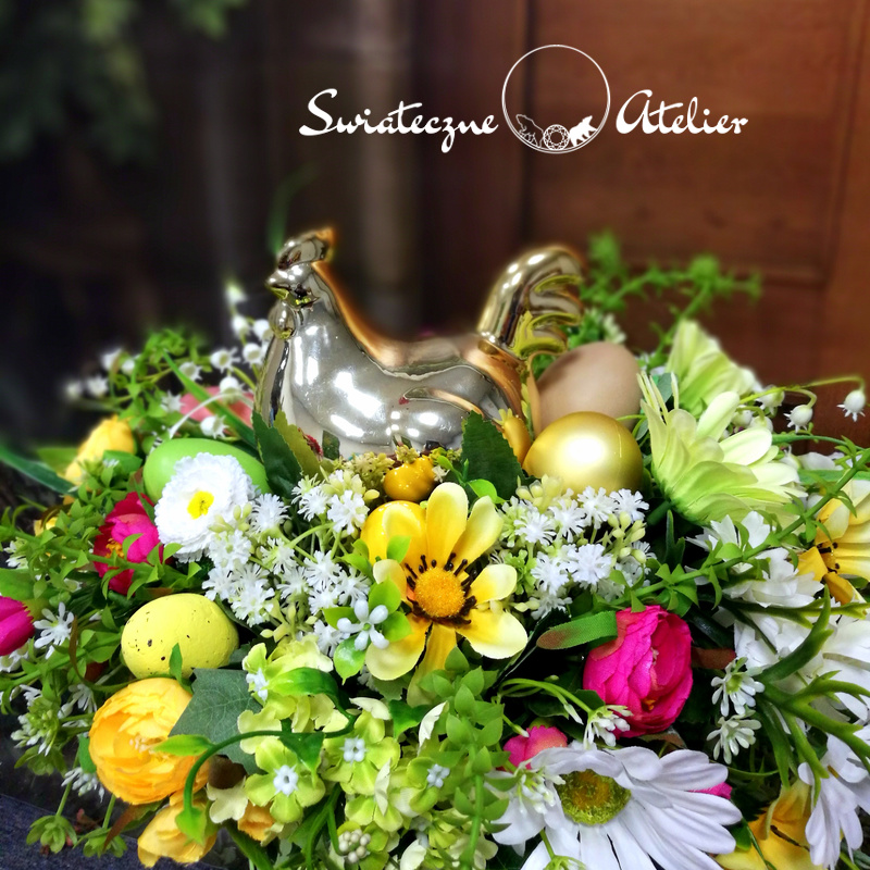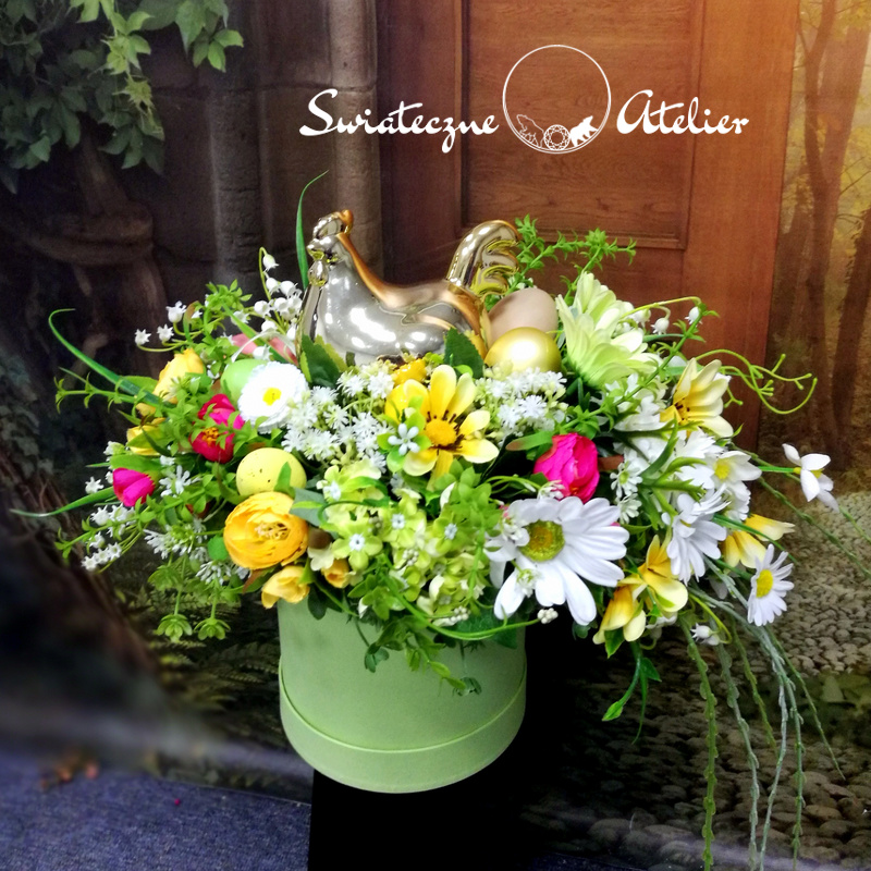 Dekoracja wielkanocna ze złotą kurą nr 1401 to piękna dekoracja, którą unieśliśmy w uroczym boxie kwiatowym Wysokiej jakości sztuczne kwiaty malowniczo prezentują się w tej osłonce. Piękna ceramiczna kura dodaje dekoracji charakteru. Kwiatostany są miękkie i delikatne w dotyku, więc do złudzenia przypominają naturalne. Kompozycja znakomicie nadaje się na prezent. Kompozycja jest urocza, utrzymana w wiosennej kolorystyce doskonale podkreśli wnętrze. Znakomicie wprowadzi ciepły nastrój.