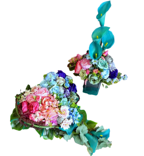 Elegancki zestaw nagrobny bukiet i serce Zorza nr 733 to śliczna, kompleksowa dekoracja przeznaczona na cmentarz. Przepiękne kalie, róże, piwonie, uzupełniają drobne kwiaty, gałązki paprotki, drobne trawy. Dekoracja w całości została wykonana ze sztucznych elementów, które do złudzenia przypominają naturalne. Kompozycję pięknie zdobią gumowe listki monstery i bluszczu. Stroik ze względu na kolorystykę znakomicie będzie prezentował się na nagrobku. Piękne serce będzie ponadczasową dekoracją. Kompozycja jest niespotykana i wyjątkowa.