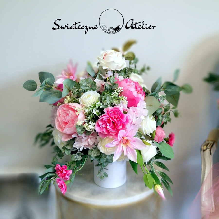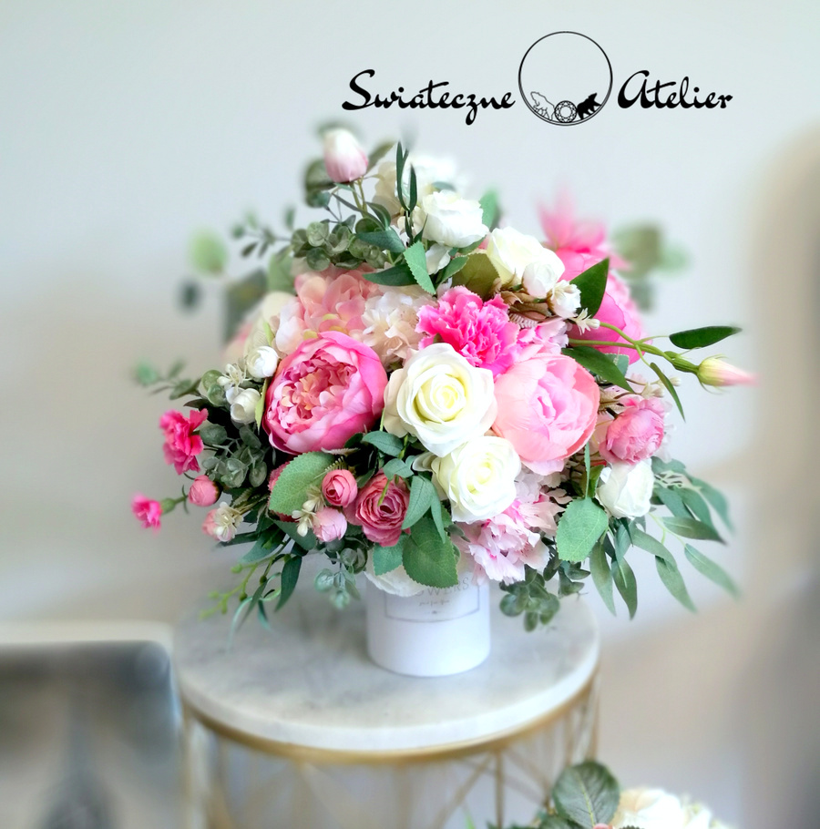 Flowerbox kwiatowy Cudowne piwonie nr 904 to przepiękna, urocza kompozycja do złudzenia przypominająca naturalne kwiaty. Cudowne piwonie, delikatne róże i pełniki oraz eukaliptus tworzą subtelną i wyjątkową dekorację. Wykorzystaliśmy tu wysokiej jakości sztuczne kwiaty, które tworzą niepowtarzalną kompozycję. Rośliny do złudzenia przypominają naturalne, dlatego trudno odróżnić je od prawdziwych. Dekoracja jest urocza i sprawdzi się w każdym wnętrzu, nadając uroczystego charakteru.