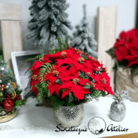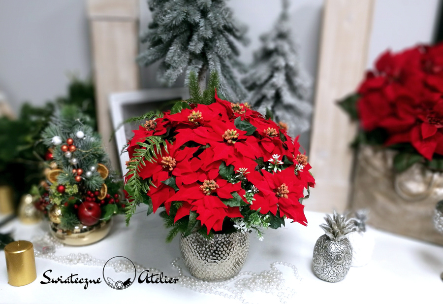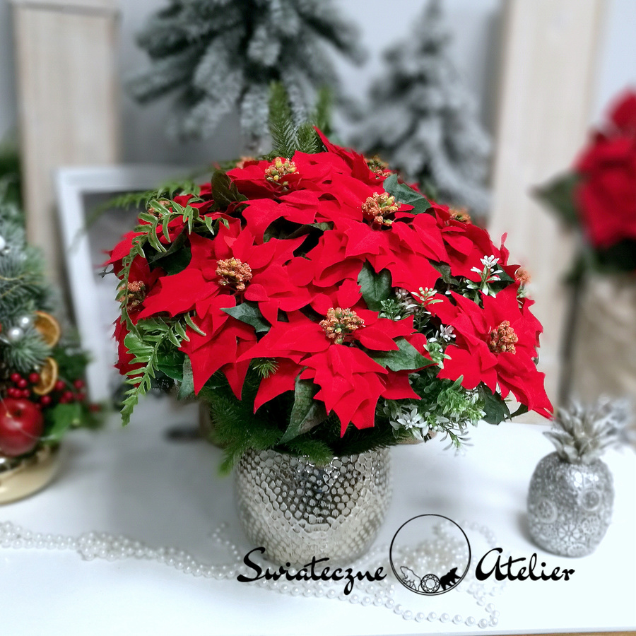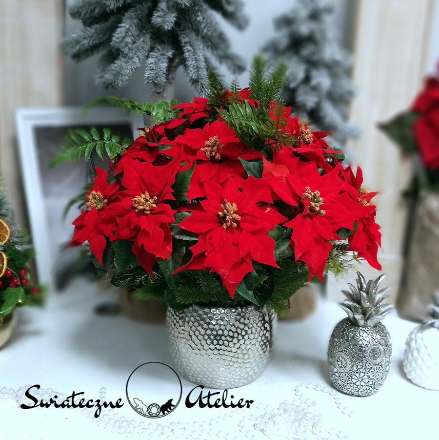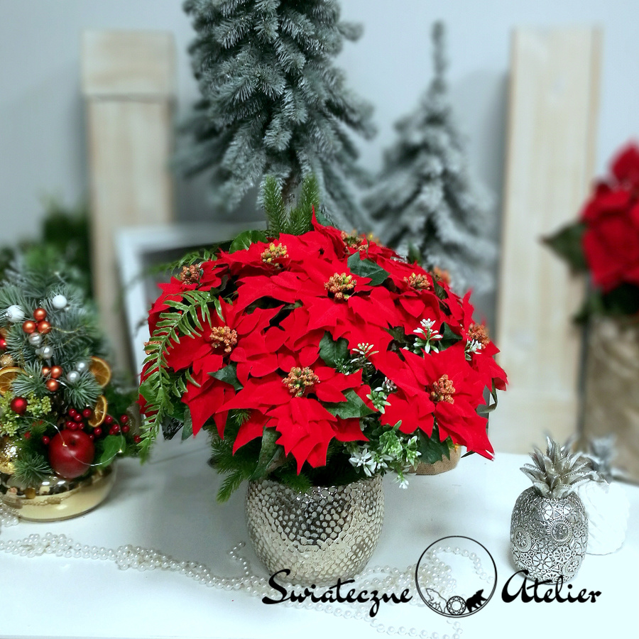 Gwiazda betlejemska jak żywa nr 400 to bardzo duża i piękna dekoracja z naszej pracowni. Kwiaty gwiazdy betlejemskiej osadziliśmy w donicy z delikatną fakturą. Kompozycję udekorowana jest sztucznymi gałązkami świerku. Całość wykonana ze sztucznych elementów. Kwiaty poinsecji wyglądają jak żywe. Jest to wyjątkowo elegancka dekoracja, która sprawi, że wnętrze rozbłyśnie świątecznym nastrojem. Świetna dekoracja, która długo będzie wyglądać pięknie.