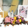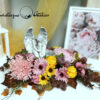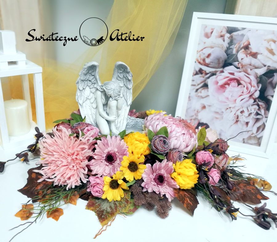 Jesienny anioł stroik nagrobny nr 1093 to śliczna dekoracja przeznaczona na cmentarz. Delikatne kwiaty w kolorze w różu i delikatnych brązach tworzą śliczną kompozycję. Dekoracja w całości została wykonana ze sztucznych elementów, które do złudzenia przypominają naturalne. Stroik ze względu na kolorystykę znakomicie będzie prezentował się na nagrobku. Piękny anioł będzie ponadczasową dekoracją. Kompozycja jest niespotykana i wyjątkowa.