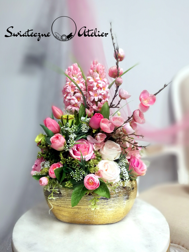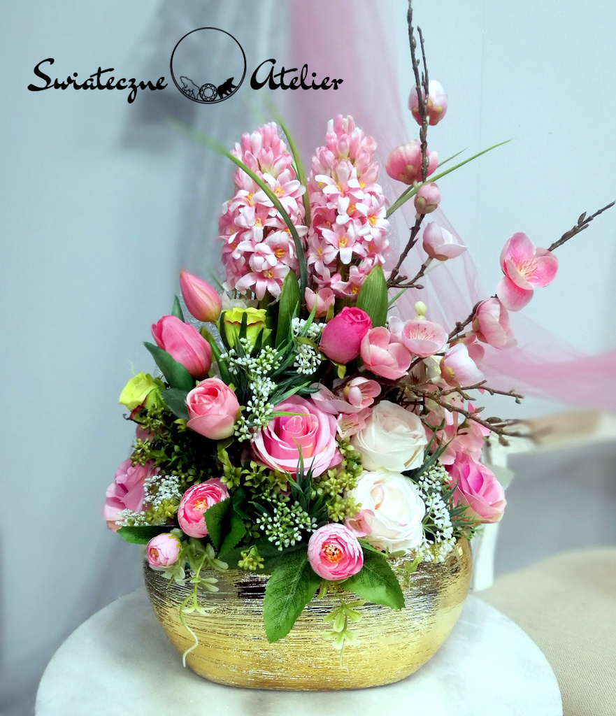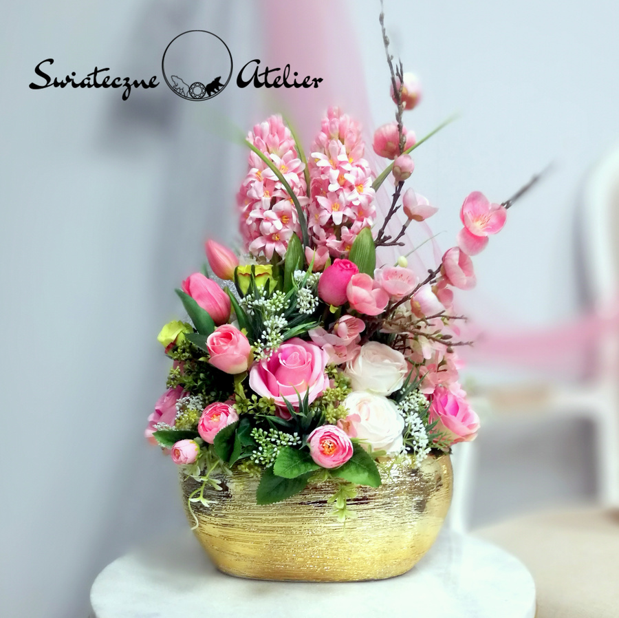 Kompozycja kwiatowa Hiacynty i magnolia nr 1141 to piękna dekoracja, którą unieśliśmy w złotej, ceramicznej donicy. Wysokiej jakości sztuczne kwiaty malowniczo prezentują się w tej osłonce. Dekoracja pięknie ozdobi wiosenny stół. Kwiatostany są miękkie i delikatne w dotyku, więc do złudzenia przypominają naturalne. Kompozycja znakomicie nadaje się na prezent. Kompozycja jest urocza, utrzymana w subtelnej kolorystyce doskonale podkreśli wnętrze. Znakomicie wprowadzi ciepły nastrój.