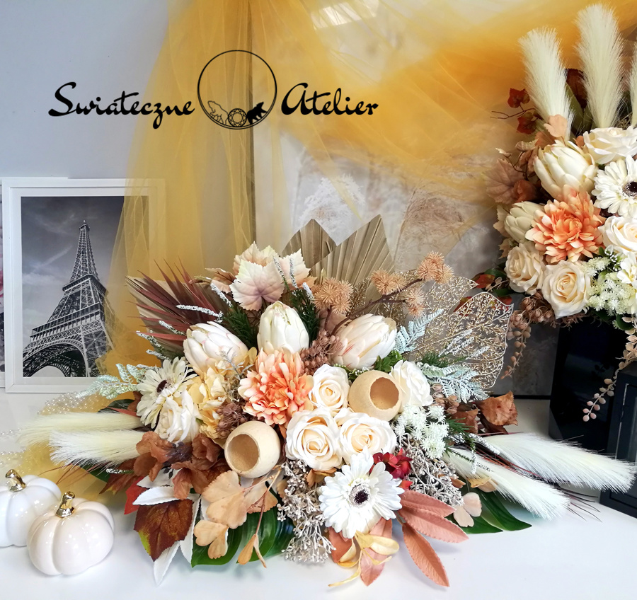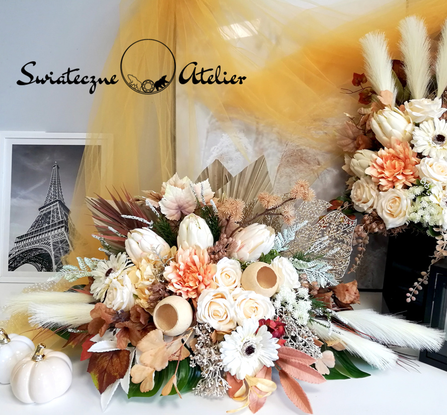 Jeżeli spodobał się Wam nasz Kompozycja nagrobna w stylu boho nr 1055 możemy dla Was przygotować w komplecie inne elementy dekoracyjne. Na przykład wianki, stroiki, itp., zgodnie z Waszymi życzeniami. Jeśli znacie lub macie firmy, które potrzebują dla zbudowania eleganckiego wizerunku pięknych dekoracji – typu hotele, restauracje, salony kosmetyczne, gabinety lekarskie, domy weselne, itp., odzywajcie się do nas. Wykonujemy dowolne dekoracje kwiatowe zgodnie ze wskazówkami zleceniodawców, łącząc Wasze pomysły z naszym talentem.