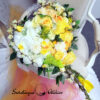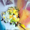 Serce nagrobne Promienie słońca nr 897 to przepiękna kompozycja kwiatowa. Dekorację nagrobną umieściłyśmy w plastikowej donicy z obciążeniem. Kwiaty, które wykorzystaliśmy w kompozycji uzupełniliśmy są zielonymi elementami. Przepiękne, kwiaty w różnych odcieniach żółtego i bieli zostały uzupełnione delikatną paprocią oraz gumowymi listkami. Klimatyczne dodatki i zielone liście tworzą wyjątkową dekorację. Kwiaty, jakie występują w tej dekoracji nagrobnej są uniwersalnej urody i dekoracja niezależnie od pory roku będzie prezentować się pięknie. Dekoracja jest czarująca. Wysokiej jakości kwiaty oraz harmonia kompozycji pięknie zaprezentują się zarówno na ciemnym jak i jasnym nagrobku. Zielone elementy kompozycji atrakcyjnie podkreślają kolor kwiatów.