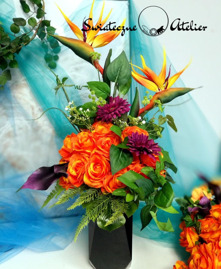 Wszystkie kwiaty wykorzystane w kompozycji to wysokiej jakości sztuczne kwiaty. Jest to elegancka alternatywa dla tradycyjnych wiązanek, sprzedawanych pod cmentarzami.