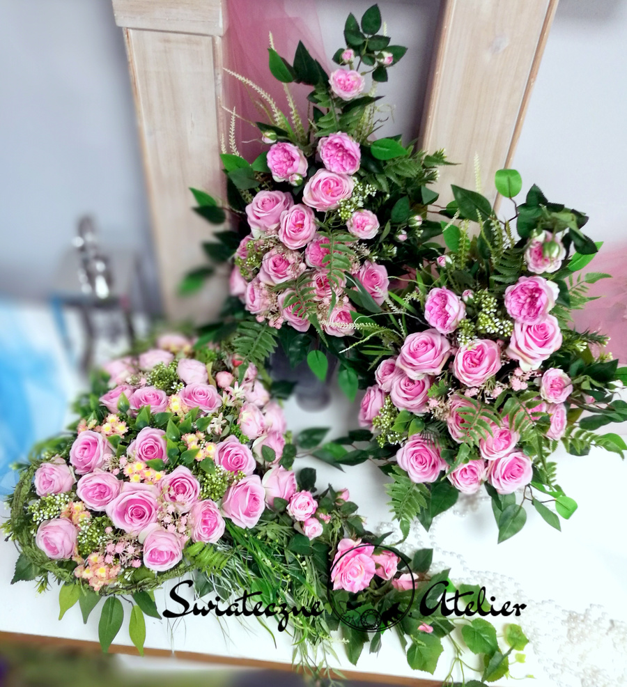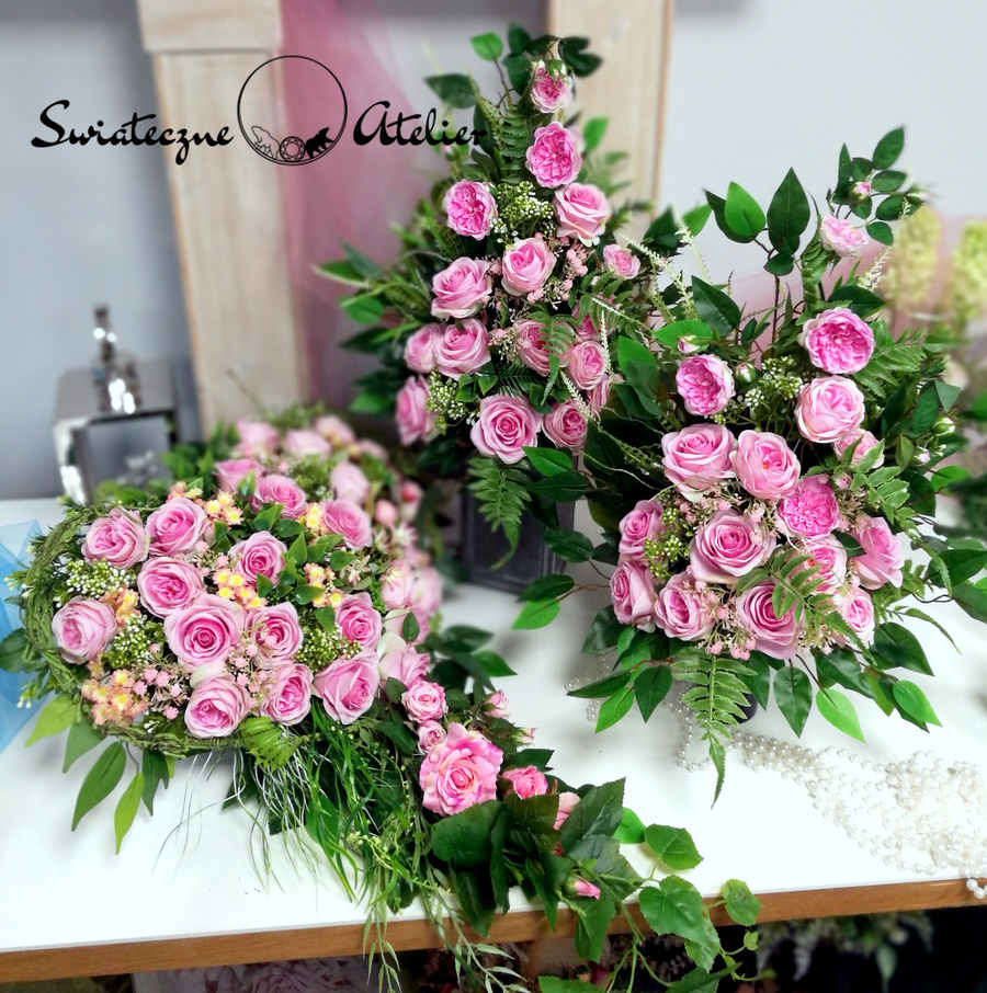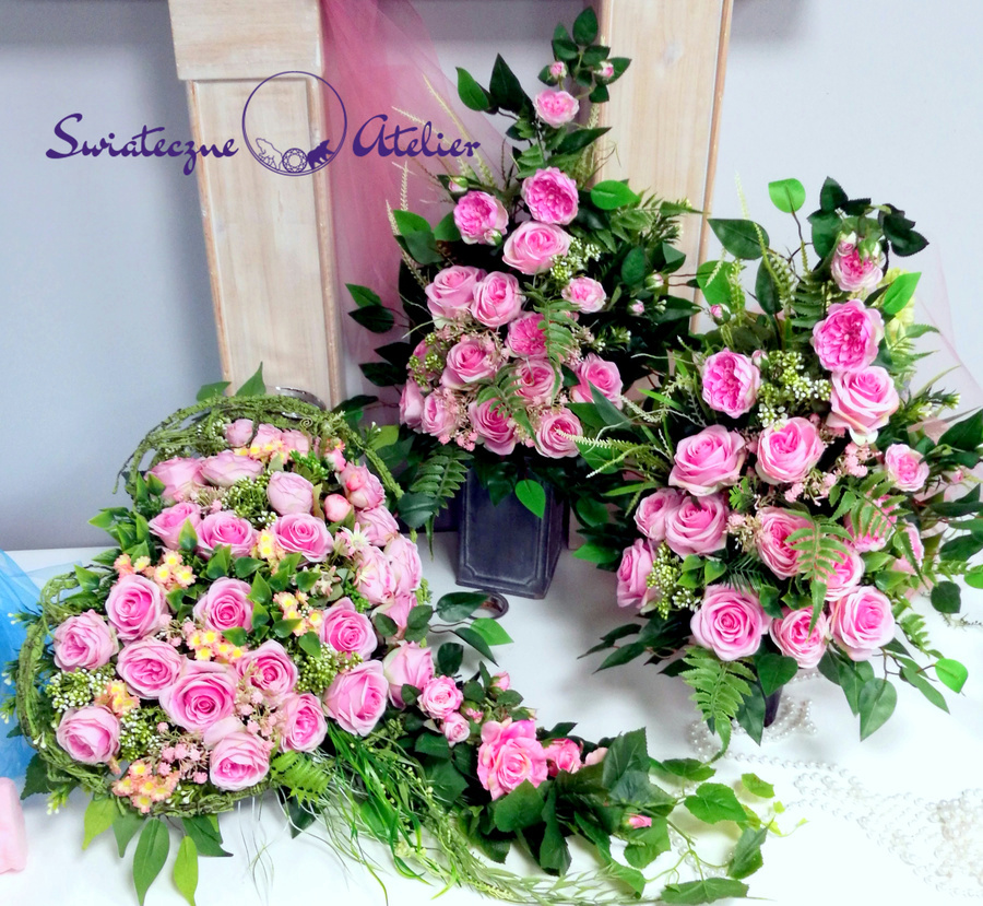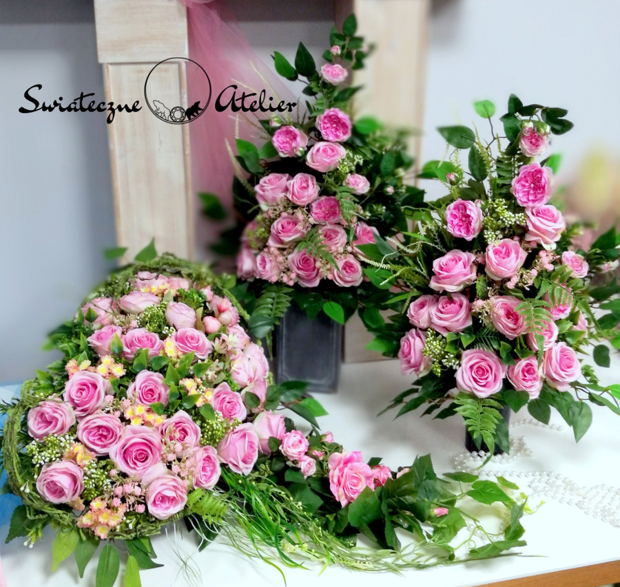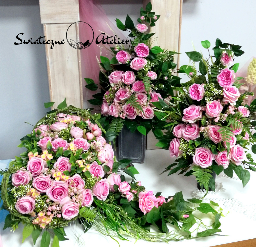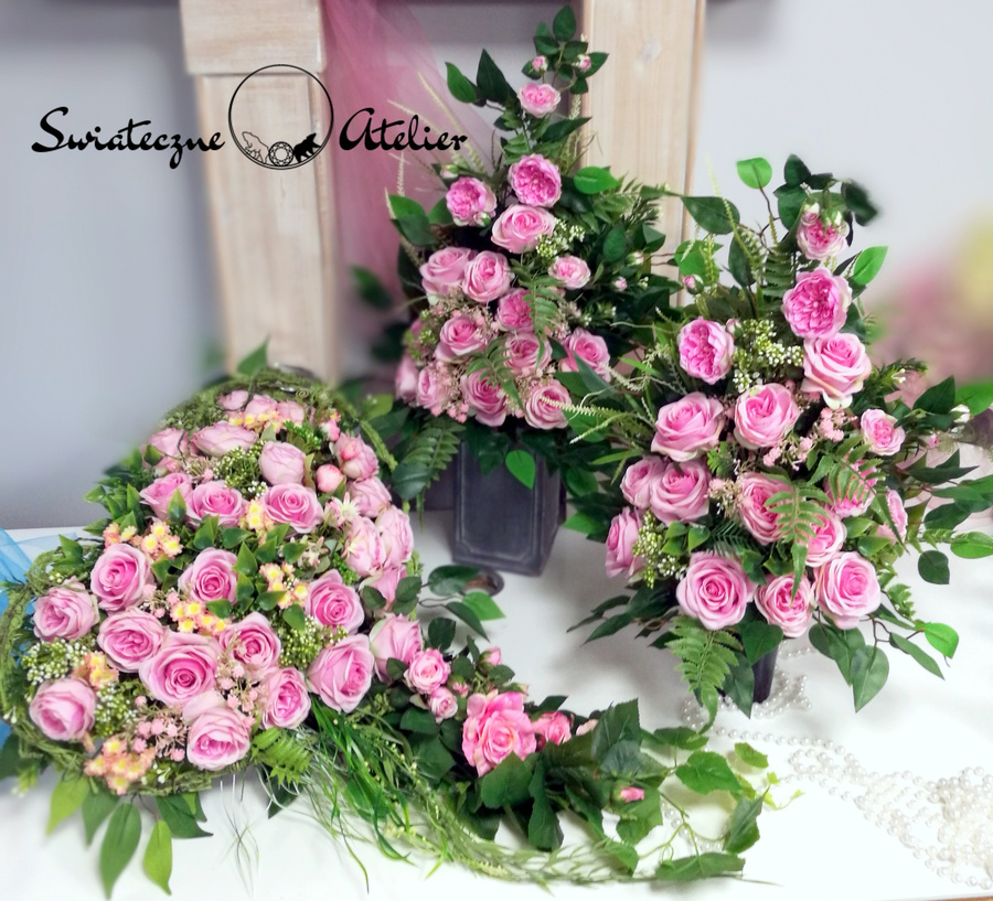 Jeżeli spodobała się Wam nasza Serce nagrobne z dwoma bukietami w różu nr 1173 możemy dla Was przygotować w komplecie inne elementy dekoracyjne, takie jak wianki, stroiki, itp., zgodnie z Waszymi życzeniami.