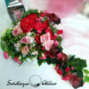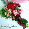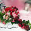 Serce w czerwieni nr 724 to śliczna, kolorowa kompozycja na płytę nagrobną. Przepiękne gerbery i róże w amarantowym kolorze przeplataj się z gałązkami jabłoni, kaliami i margerytkami. Zielone listki podkreślają kolor kwiatów. Dekorację w całości wykonaliśmy ze sztucznych elementów, więc do złudzenia przypomina naturalną kompozycję. Stroik nagrobny pięknie zdobią zielone dodatki. Ze względu na kolorystykę oraz wykorzystane materiały, znakomicie zaprezentuje się na nagrobku.