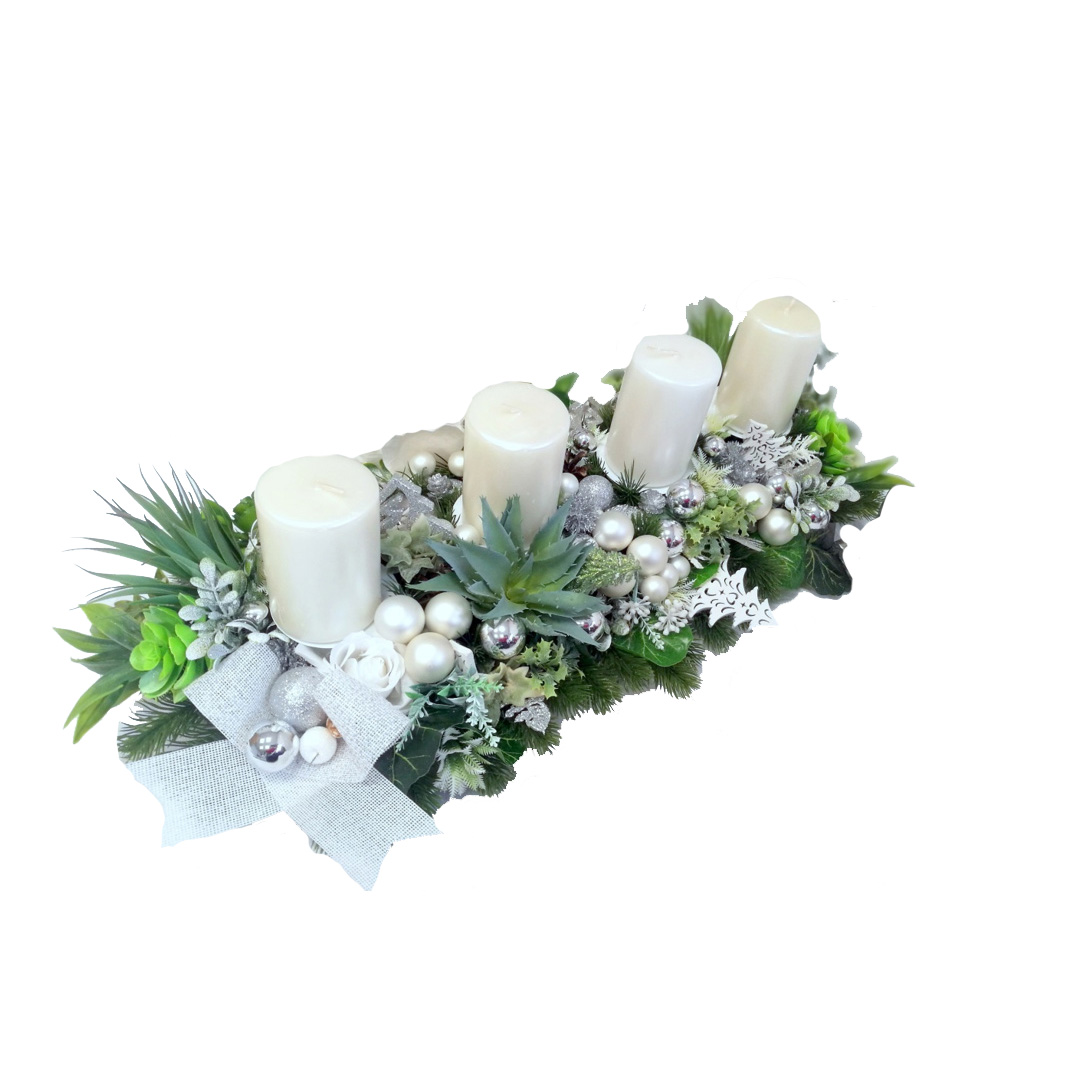 Srebrzysty stroik z sukulentami L nr 394 to piękna dekoracja dla miłośników nietuzinkowych dodatków do wnętrza. Pięknie ozdobi stół w czasie świątecznych spotkań, jak i również salon, kominek czy też jadalnię. Może stanowić wyszukany prezent dla tych, którzy gustują w niecodziennych dekoracjach domu. Cudowna dekoracja do restauracji, hoteli, pensjonatów.