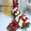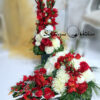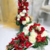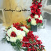 Stroik i bukiet Czerwień i ecru nr 571 jest to śliczna kompozycja kwiatowa. Kwiaty wykorzystane w kompozycji zostały uzupełnione zielonymi elementami. Stroik umieściliśmy w obciążonej podstawie a bukiet w plastikowym wkładzie. Przepiękne jesienne chryzantemy, klimatyczne dodatki, zielone liście leszczyny tworzą wyjątkową dekorację. Kwiaty zastosowane do tej dekoracji nagrobnej są w pięknych kolorach i dekoracja niezależnie od pory roku będzie prezentować się pięknie. Prosta forma nadaje kompozycji lekkości i elegancji. Wysokiej jakości kwiaty oraz harmonia kompozycji pięknie będzie prezentować się zarówno na ciemnym jak i jasnym nagrobku. Zielone elementy podkreślają kolor kwiatów. Dekoracja jest niespotykana i przepiękna.