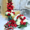 Wszystkie kwiaty wykorzystane w kompozycji to wysokiej jakości sztuczne kwiaty. Jest to elegancka alternatywa dla tradycyjnych wiązanek, sprzedawanych pod cmentarzami.