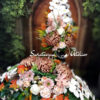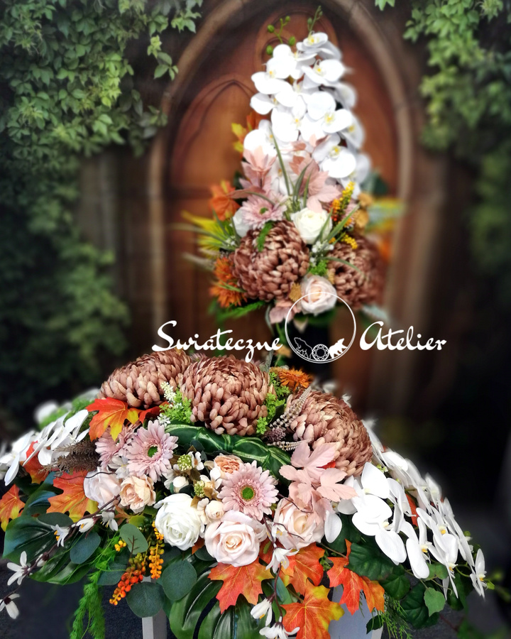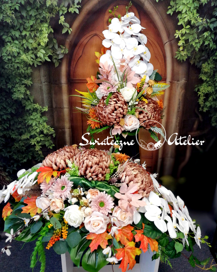 Stroik i bukiet nagrobny Cappuccino i biel nr 1472 jest to elegancka, duża kompozycja kwiatowa. Dekorację osadziliśmy w betonowej podstawie a bukiet w plastikowym, uniwersalnym wkładzie. Piękne chryzantemy w wyjątkowej kolorystyce, gumowe storczyki i zielone dodatki tworzą uroczą kompozycję. Kwiaty zastosowane do tej dekoracji nagrobnej są w klimatycznych kolorach i dekoracja długo będzie prezentować się pięknie. Prosta forma nadaje kompozycji lekkości i elegancji. Wysokiej jakości kwiaty oraz harmonia kompozycji pięknie będzie prezentować się zarówno na ciemnym jak i jasnym nagrobku. Dekoracja ta jest niespotykana a zielone elementy podkreślają kolor zastosowanych kwiatów.