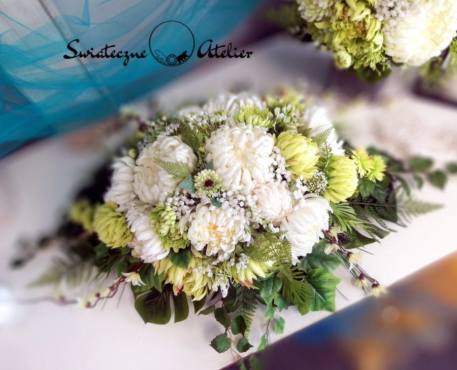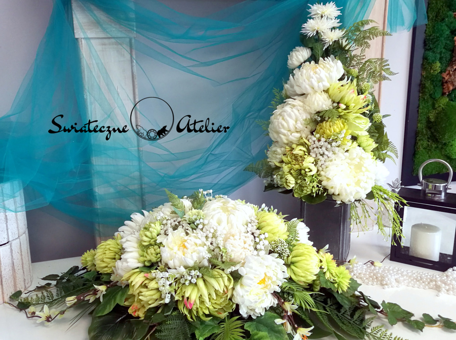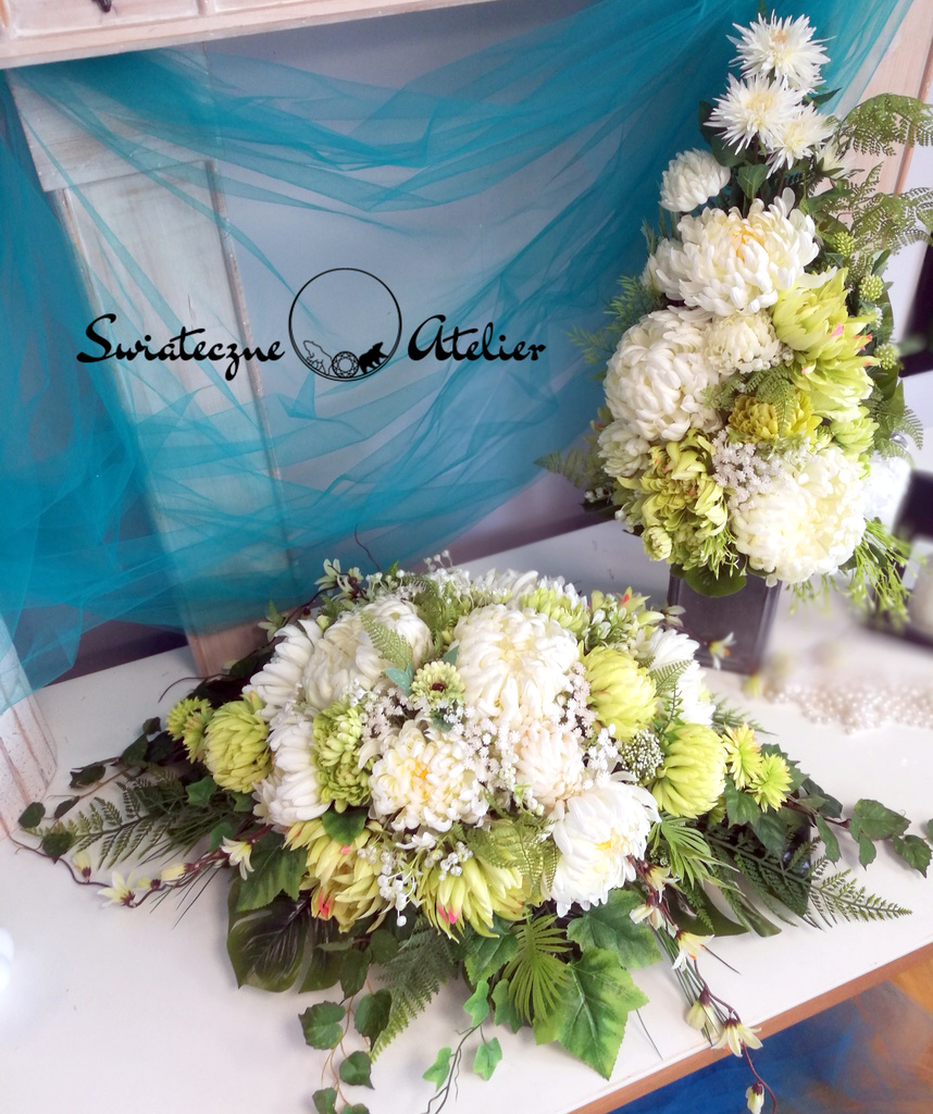 Jeżeli spodobała się Wam nasz Stroik i bukiet nagrobny Delikatne chryzantemy nr 1080 możemy dla Was przygotować w komplecie inne elementy dekoracyjne, takie jak wianki, girlandy itp., zgodnie z Waszymi życzeniami, które możecie nam przekazać.