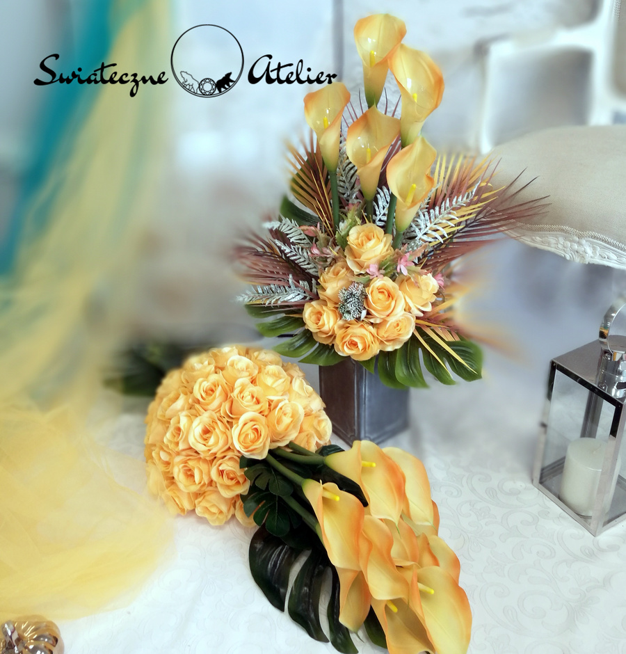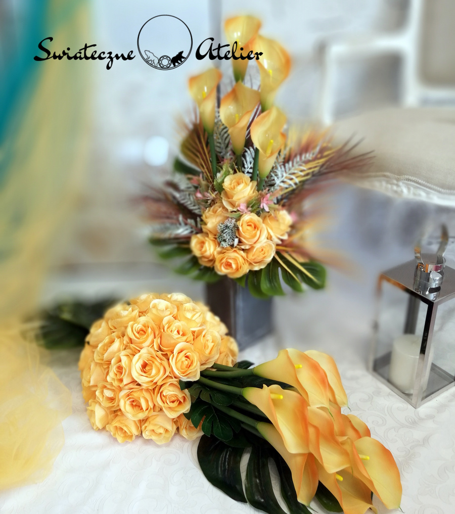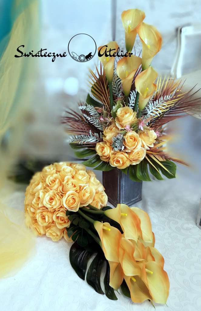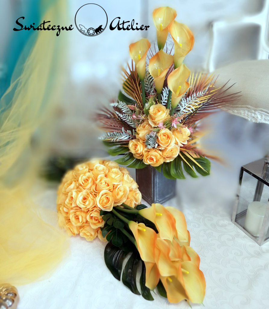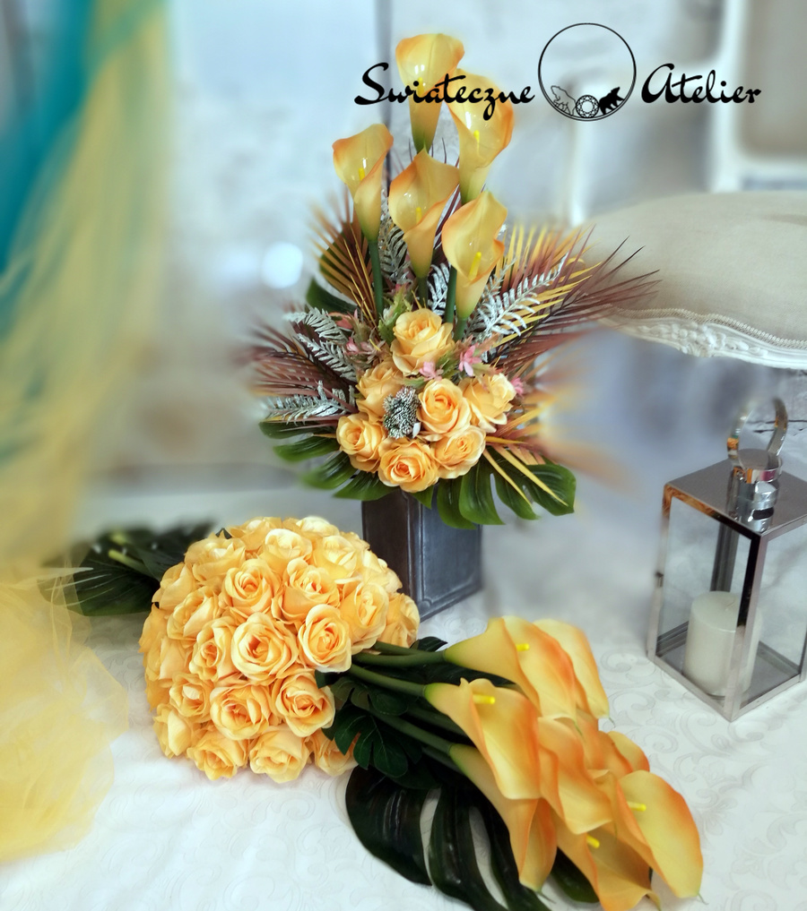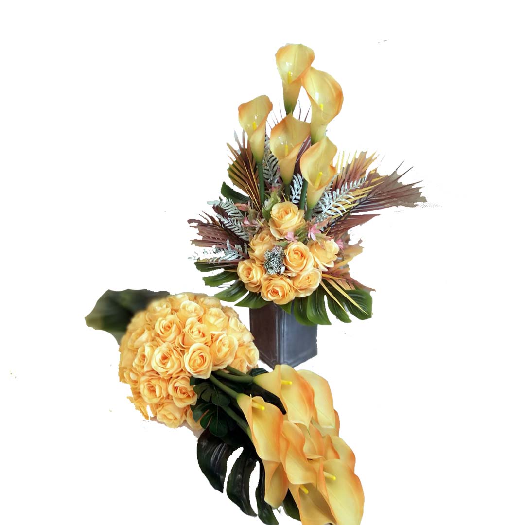 Stroik i bukiet nagrobny w Cieniu Akacji 3 nr 561 to unikatowa i piękna kompozycja kwiatowa. Kompozycja jest przede wszystkim jest niezwykle elegancka i duża. Składają się na nią kolejno : róże i gumowe kalie. 10 kalii w kolorze kremowo żółtym o długości 72 cm ułożyliśmy warstwowo w kuli kwiatowej. Całość osadziliśmy na betonowej podstawce, by zabezpieczyć kompozycję przed wiatrem. Kalie i róże pięknie ze sobą współgrają tworząc harmonijną całość.
