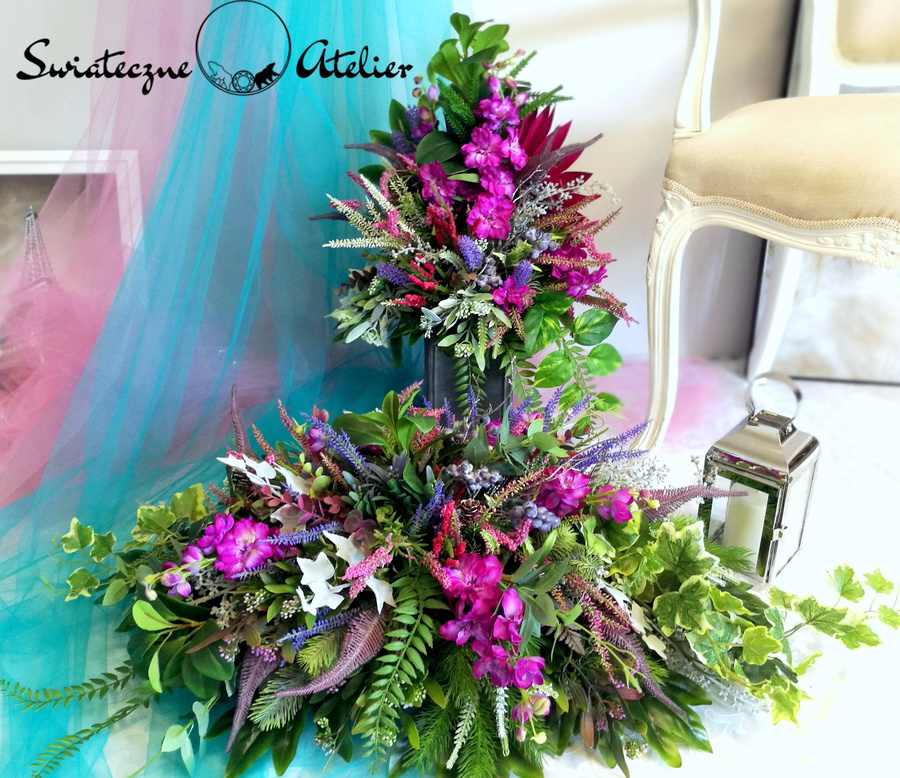 Stroikhttps://www.swiateczneatelier.pl/produkt/dekoracja-kwiatowa-pogodny-poranek-nr-673/ nagrobny Wiosenna symfonia 2 nr 692 to śliczna, kolorowa kompozycja na płytę nagrobna. Przepiękne gałązki uzupełniliśmy liśćmi monstery, gałązkami paprotki oraz pąkami róż. Dekoracja w całości wykonaliśmy ze sztucznych elementów, więc do złudzenia przypominają naturalne. Kompozycję pięknie zdobią gumowe liście palmy. Stroik ze względu na kolorystykę oraz wykorzystane materiały, znakomicie zaprezentuje się na nagrobku. Każdą z naszych dekoracji wykonujemy ręcznie, więc gwarantujemy, że dekoracja, którą Wam dostarczymy, będzie jedyna w swoim rodzaju. Ze względu na to, że nasze kompozycje wykonujemy są za każdym razem ręcznie oraz sezonowość wykorzystywanych w kompozycjach dodatków – kompozycja przygotowana dla Państwa może delikatnie różnić się od przedstawionej na zdjęciu. Gwarantujemy natomiast jakość i estetykę wykonania Państwa zamówienia. także własne rozwiązania.