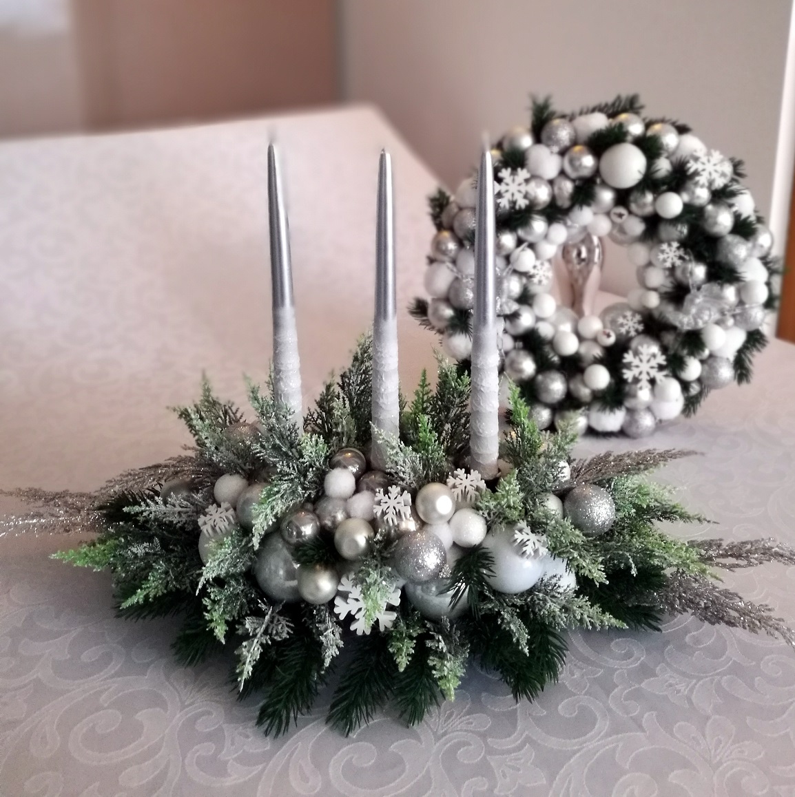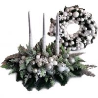 Stroik świąteczny i wianek komplet Mroźna noc roz. M jest to dekoracja świąteczna dla wymagających klientów. Wykonaliśmy ją ręcznie z wysokiej jakości materiałów, więc gwarantujemy, że każda dekoracja jest inna i niepowtarzalna. Zastosowane materiały to bombki szklane, plastikowe, styropianowe. Wysokiej jakości sztuczne gałązki świerku, przepiękna ośnieżona tuja, srebrne listki uzupełniają kompozycję. Srebrne, zamarznięte bombki, drewniane śnieżynki wywołują wrażenie chłodu, więc cała kompozycja wygląda jak pokryta szronem. Stroik pięknie udekoruje Wasze stoły wigilijne a wianek drzwi, okno czy kominek. Znakomicie sprawdzi się jako nietuzinkowy prezent.
