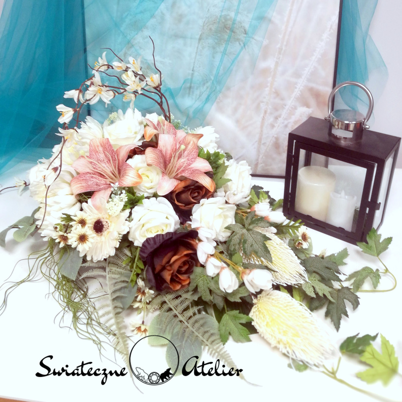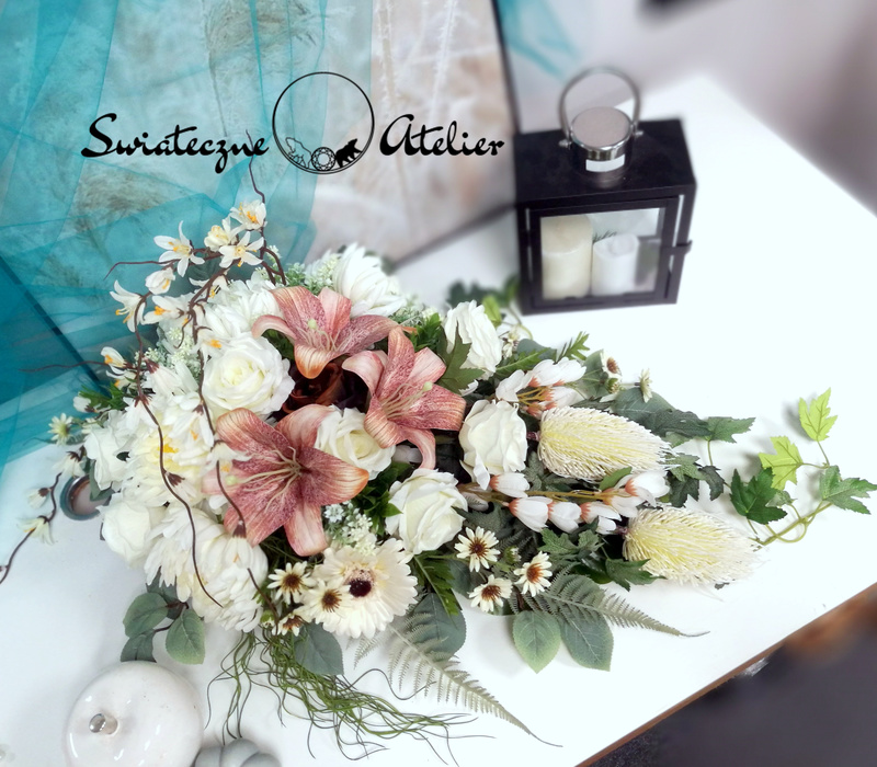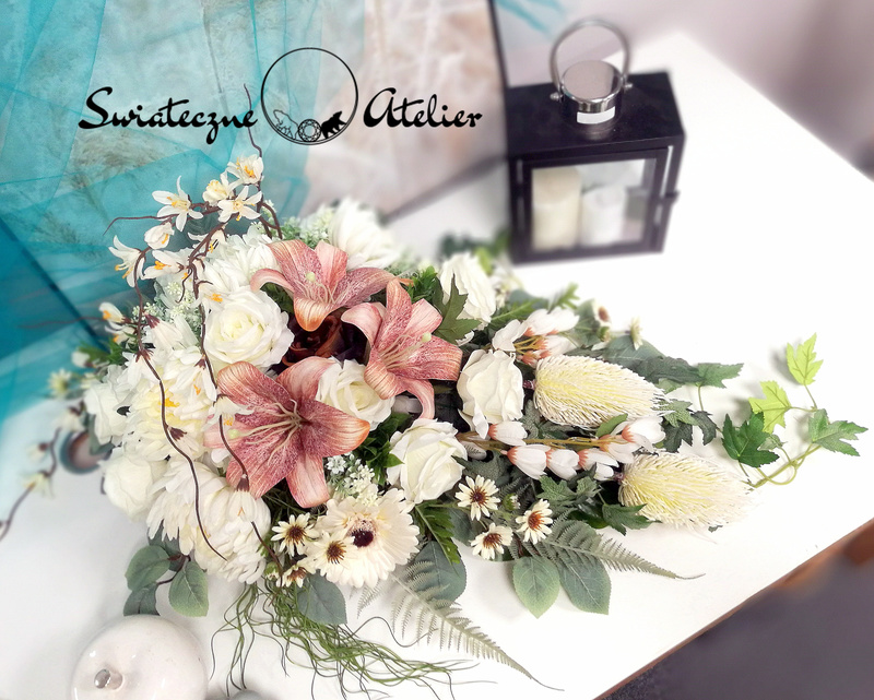 Każdą z naszych dekoracji wykonujemy ręcznie, więc gwarantujemy, że dekoracja, którą Wam dostarczymy, będzie jedyna w swoim rodzaju. Ze względu na to, że nasze kompozycje wykonujemy są za każdym razem ręcznie oraz sezonowość wykorzystywanych w kompozycjach dodatków – kompozycja przygotowana dla Państwa może delikatnie różnić się od przedstawionej na zdjęciu. Gwarantujemy natomiast jakość i estetykę wykonania Państwa zamówienia. Dekoracja