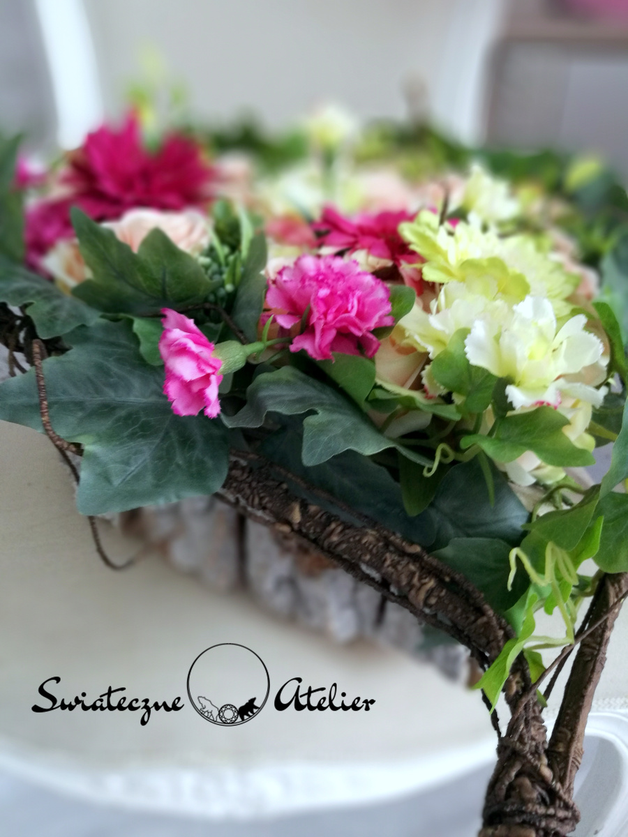 Wszystkie kwiaty wykorzystane w kompozycji to wysokiej jakości sztuczne kwiaty, które z pewnej odległości są nie do odróżnienia od swoich oryginałów. Ich atutem natomiast jest to, że nie wymagają podlewania, nie więdną i zawsze wyglądają równie świeżo, jak na początku.