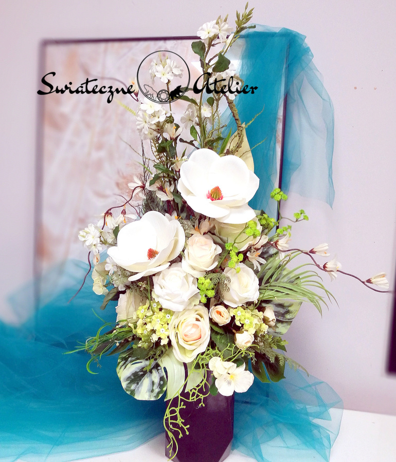 Stroik nagrobny z bukietem Biała Magnolia nr 1385 jest to piękna, okazała kompozycja kwiatowa. Dekoracja na płytę to stroik kwiatowy osadzony na czarnej desce z piękną aplikacją a bukiet w plastikowym wkładzie. Cudownej jakości magnolie pięknie pięknie się prezentują , aplikacja uzupełniona zielonymi dodatkami oraz zwiewnymi kwiatami wygląda delikatnie i elegancko. Kwiaty utrzymaliśmy w subtelnej kolorystyce, więc tworzą wyjątkową kompozycję. Rośliny, których użyliśmy do tej dekoracji nagrobnej są w pięknych kolorach i dekoracja niezależnie od pory roku będzie prezentować się pięknie. Klimatyczne dodatki stanowią uzupełnienie kompozycji. Ciekawa forma nadaje bukietowi charakteru i elegancji. Wysokiej jakości kwiaty oraz harmonia kompozycji pięknie zaprezentują się zarówno na ciemnym jak i jasnym nagrobku. Zielone elementy podkreślają kolor kwiatów dekoracji.