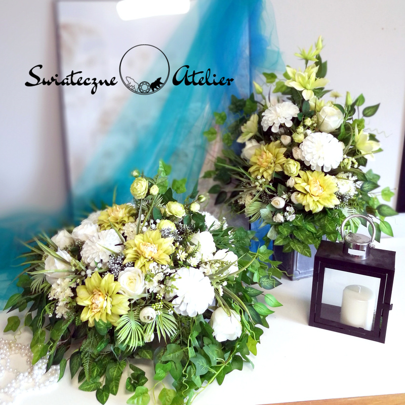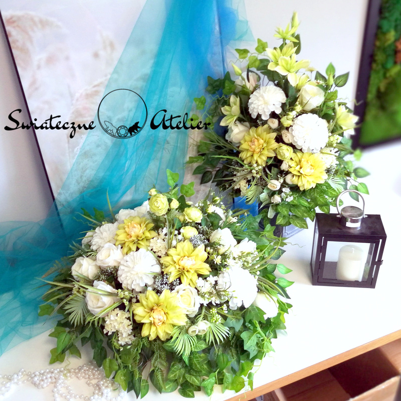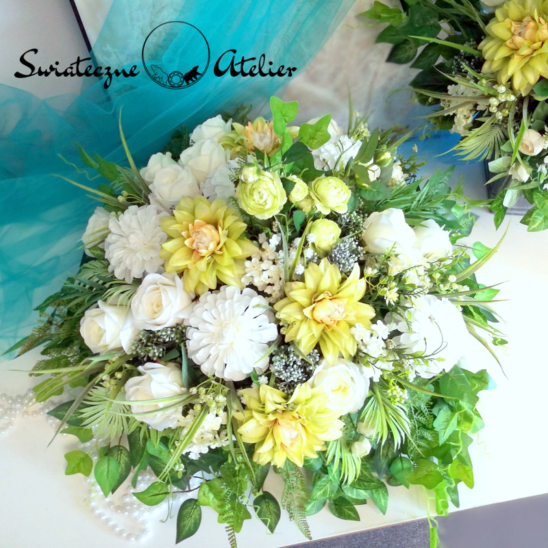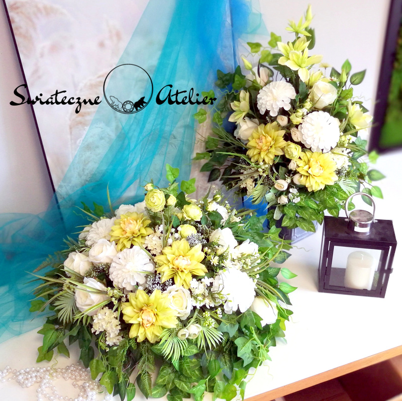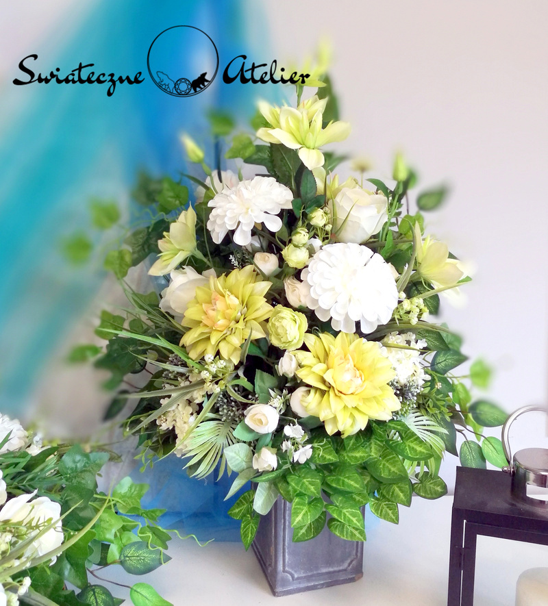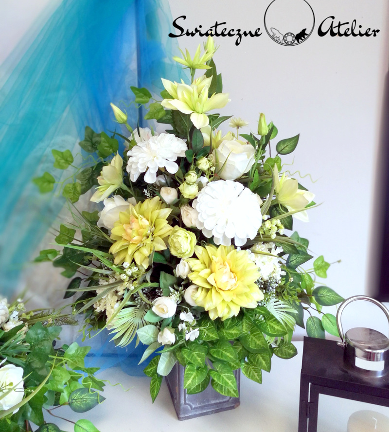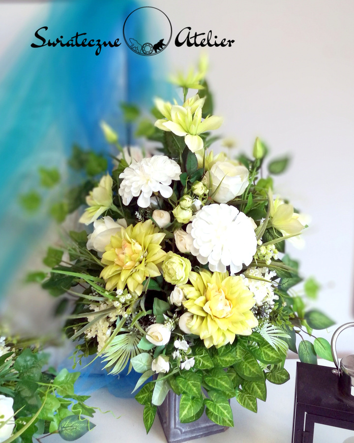 Wszystkie kwiaty wykorzystane w kompozycji to dobrej jakości sztuczne kwiaty i doskonale imitują te prawdziwe.