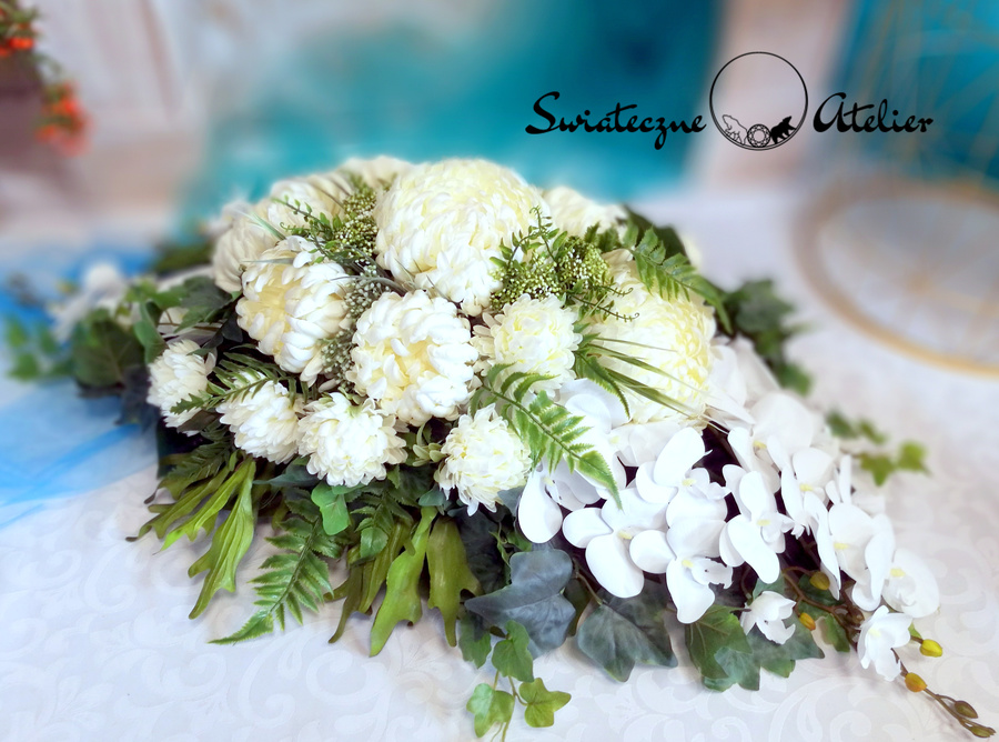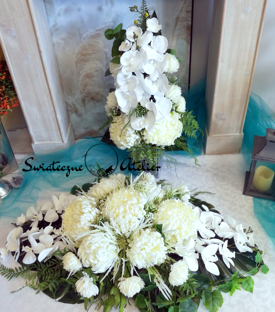Jeżeli spodobała się Wam nasz Stroik nagrobny z bukietem Odcienie bieli nr 836 możemy dla Was przygotować w komplecie inne elementy dekoracyjne, takie jak wianki, girlandy itp., zgodnie z Waszymi życzeniami, które możecie nam przekazać.