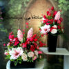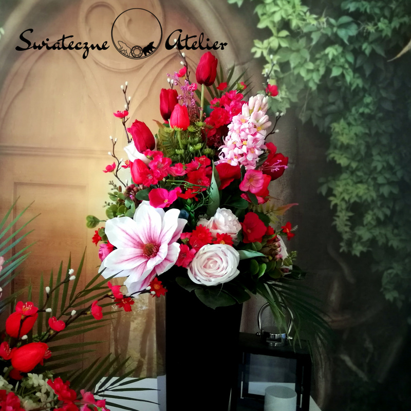 Wszystkie kwiaty wykorzystane w kompozycji to dobrej jakości sztuczne kwiaty i doskonale imitują te prawdziwe.