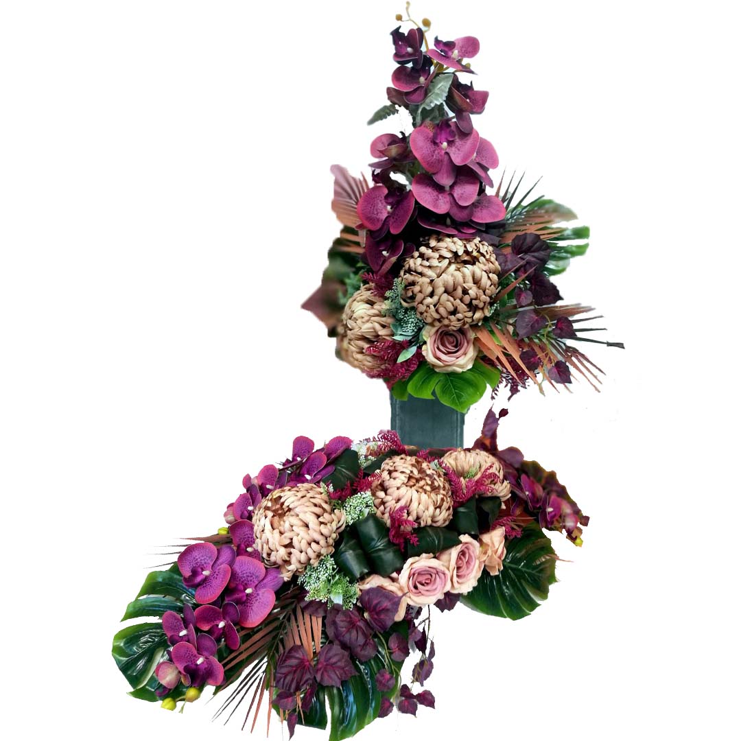 Stroik nagrobny z dwoma bukietami Cappuccino i Fiolet nr 1470 jest to elegancka, duża kompozycja kwiatowa. Dekorację osadziliśmy w betonowej podstawie a bukiety w plastikowych wkładach. Piękne chryzantemy w wyjątkowej kolorystyce, gumowe storczyki i zielone dodatki tworzą uroczą kompozycję. Kwiaty zastosowane do tej dekoracji nagrobnej są w klimatycznych kolorach i dekoracja długo będzie prezentować się pięknie. Prosta forma nadaje kompozycji lekkości i elegancji. Wysokiej jakości kwiaty oraz harmonia kompozycji pięknie będzie prezentować się zarówno na ciemnym jak i jasnym nagrobku. Dekoracja ta jest niespotykana a zielone elementy podkreślają kolor zastosowanych elementów.